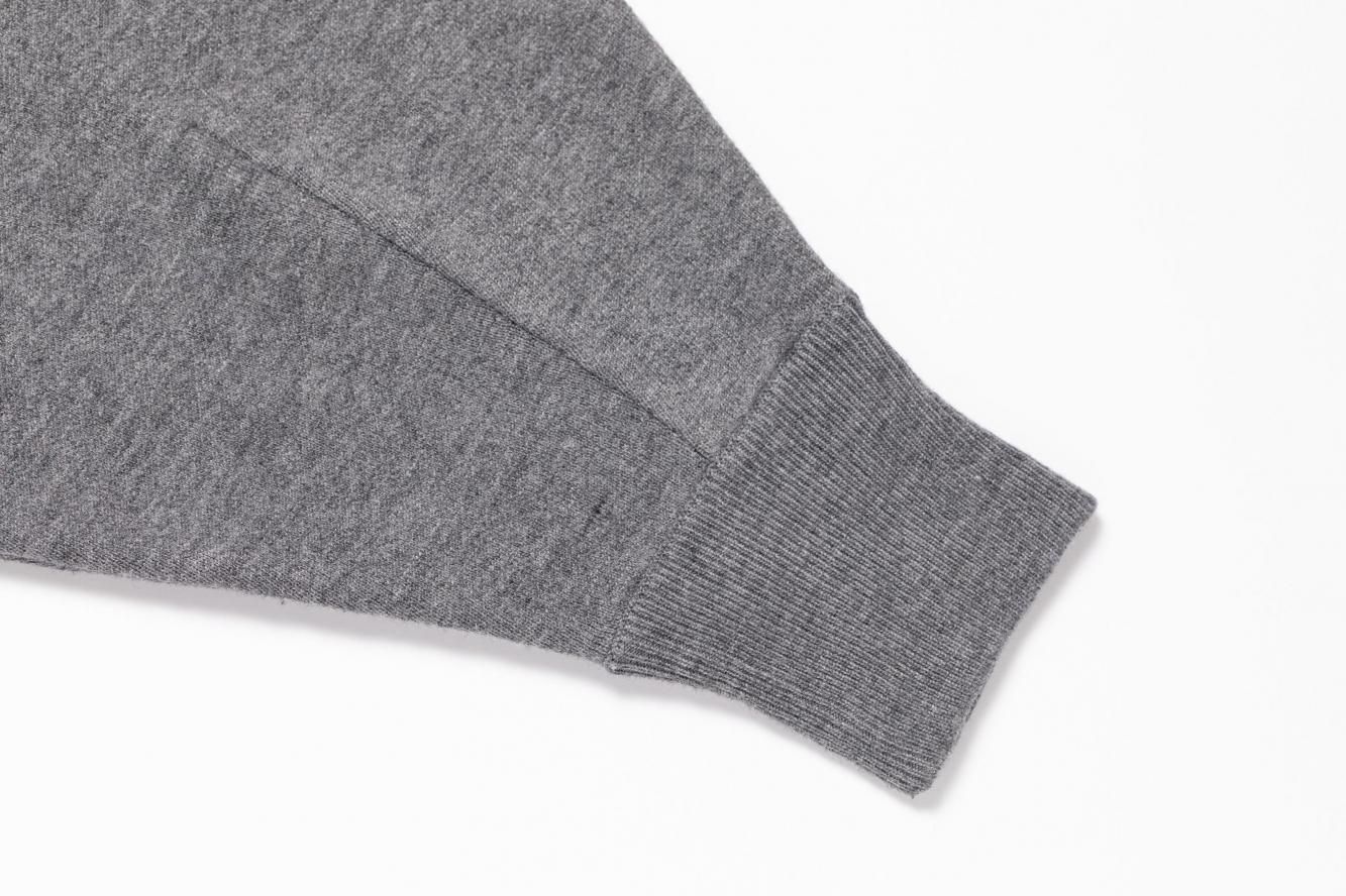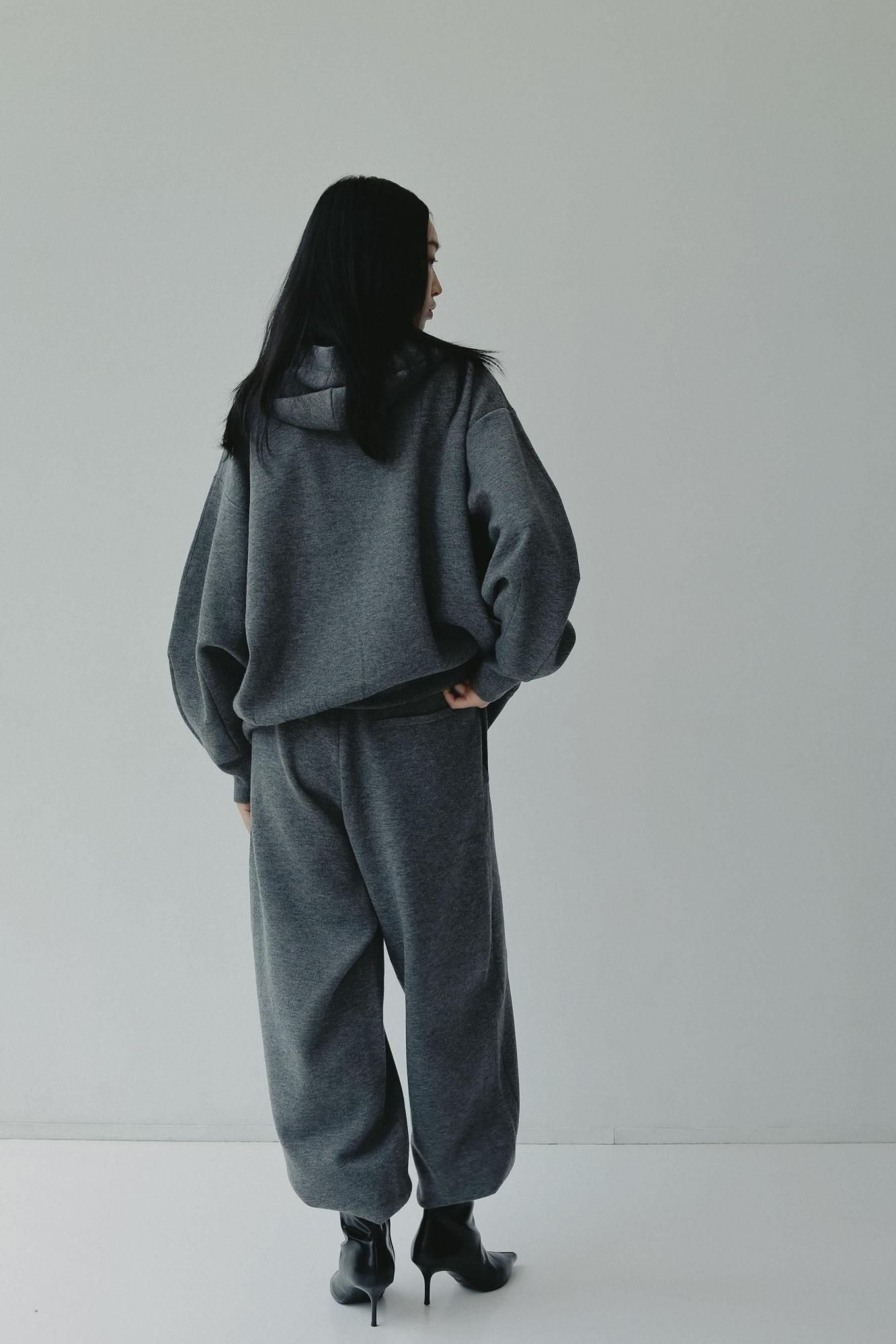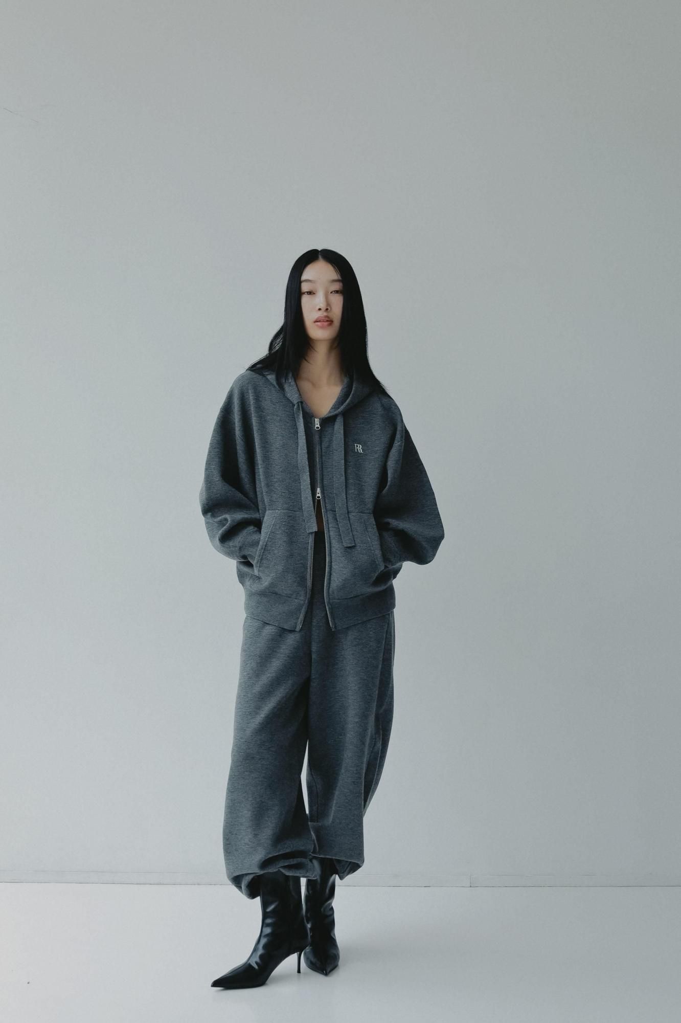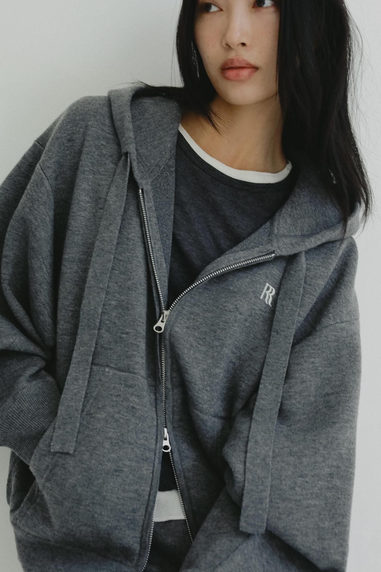 しっかりとした編地ながら柔らかく、ストレッチ性があるため動きやすく快適な着心地が特徴です。左胸に施されたロゴ刺繍がアクセントとなり、シンプルながらも存在感を放ちます。逆開ファスナーと太めのニット紐が、カジュアルな中にもモードな雰囲気をプラス。かなりオーバーシルエットで、リラックス感と女性らしさを兼ね備えた一枚です。