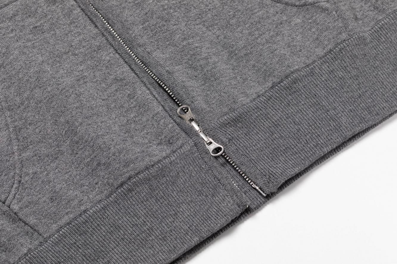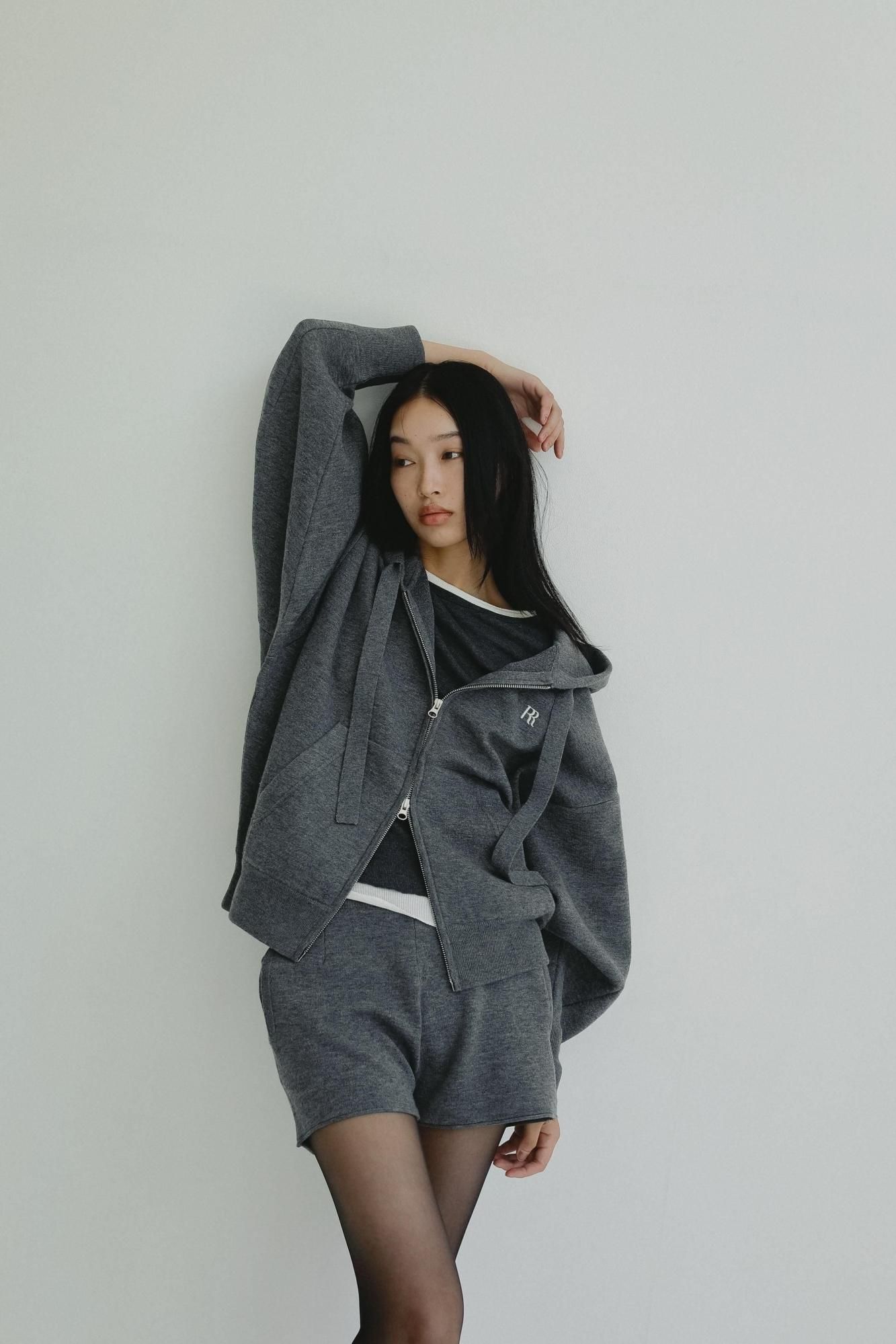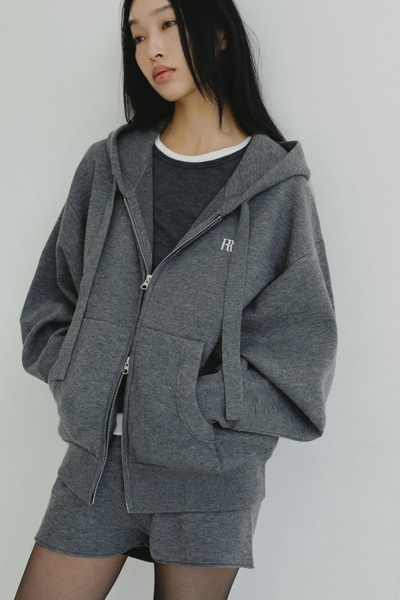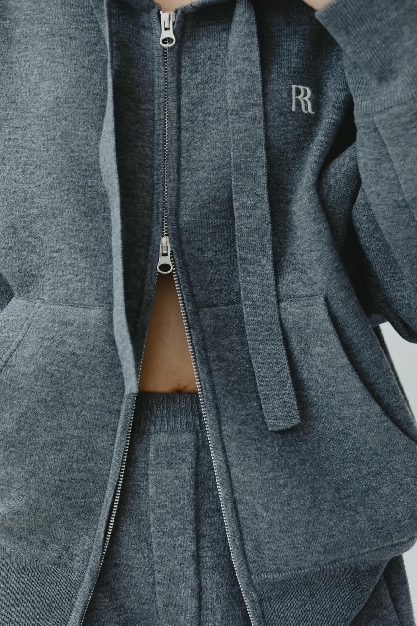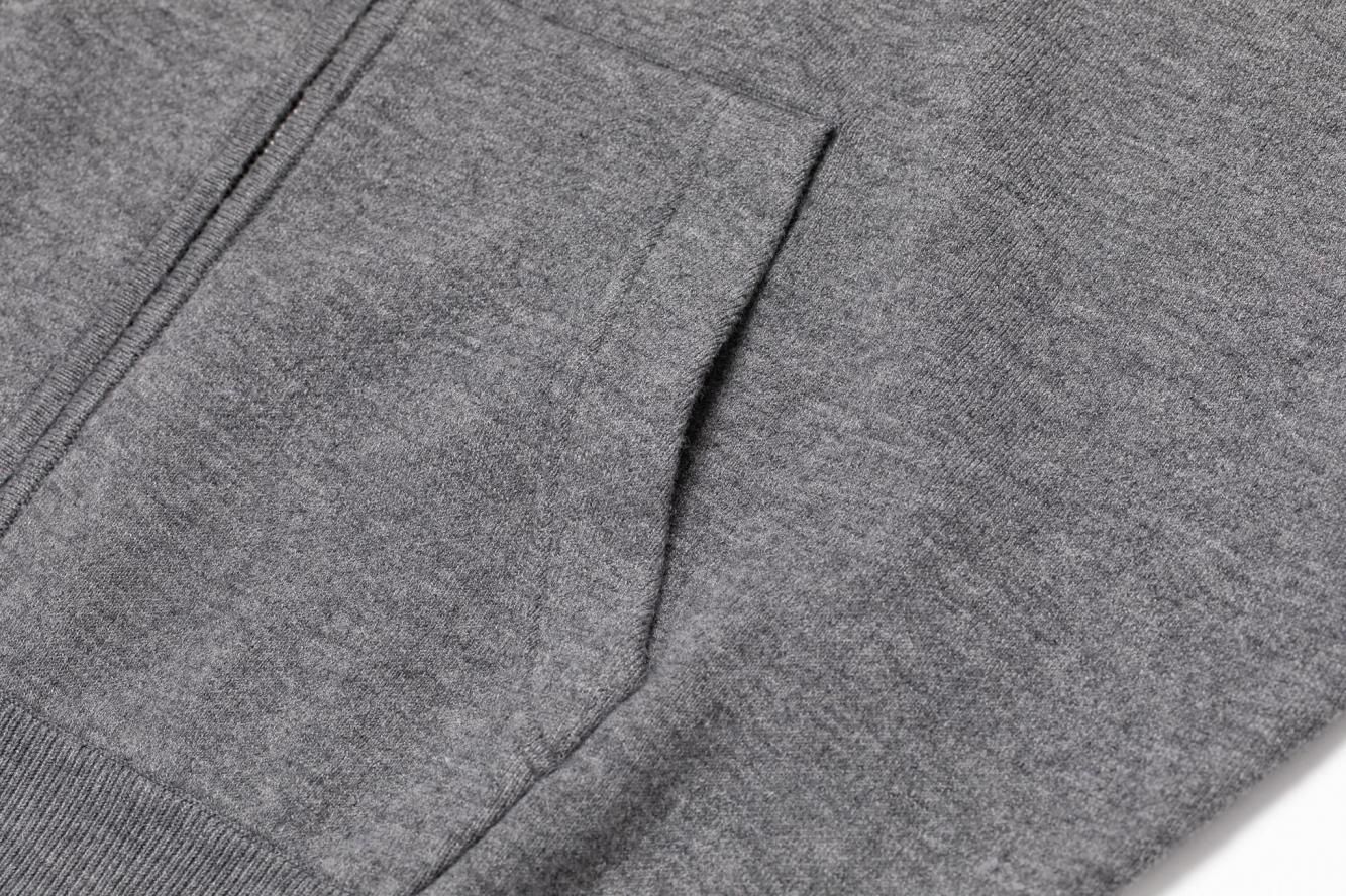 しっかりとした編地ながら柔らかく、ストレッチ性があるため動きやすく快適な着心地が特徴です。左胸に施されたロゴ刺繍がアクセントとなり、シンプルながらも存在感を放ちます。逆開ファスナーと太めのニット紐が、カジュアルな中にもモードな雰囲気をプラス。かなりオーバーシルエットで、リラックス感と女性らしさを兼ね備えた一枚です。