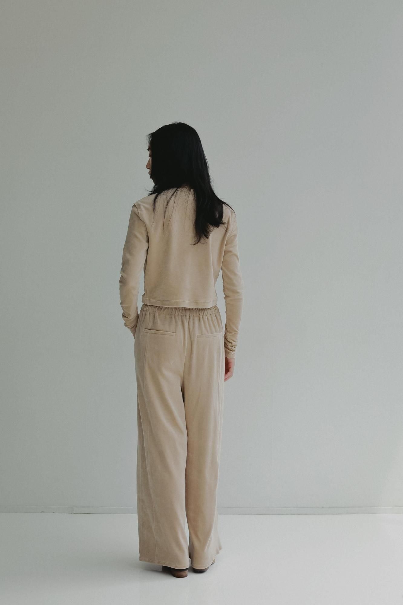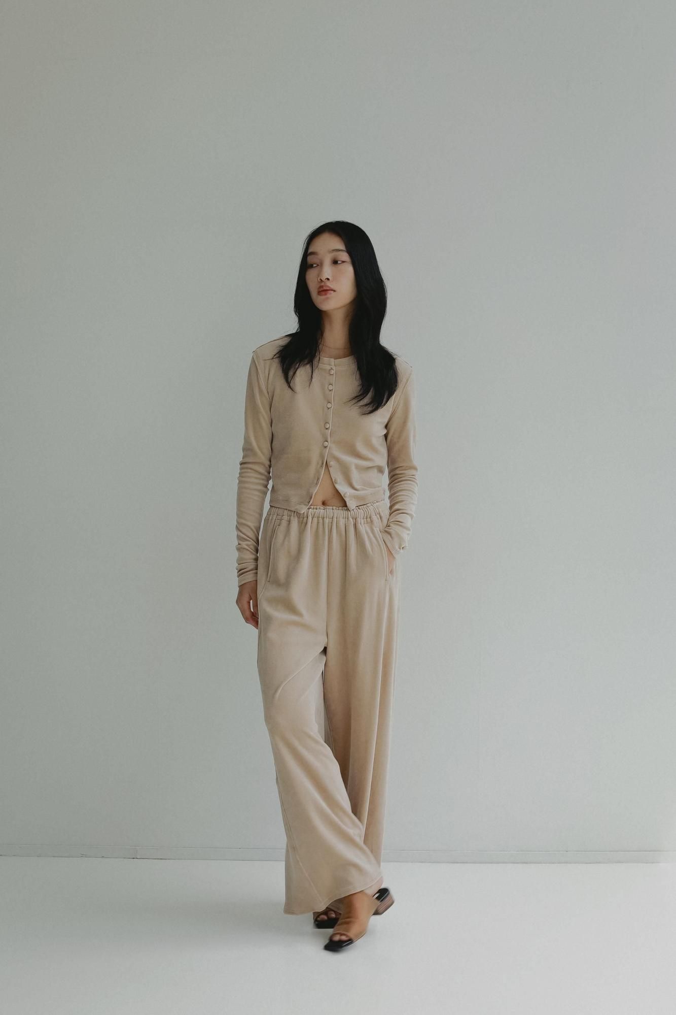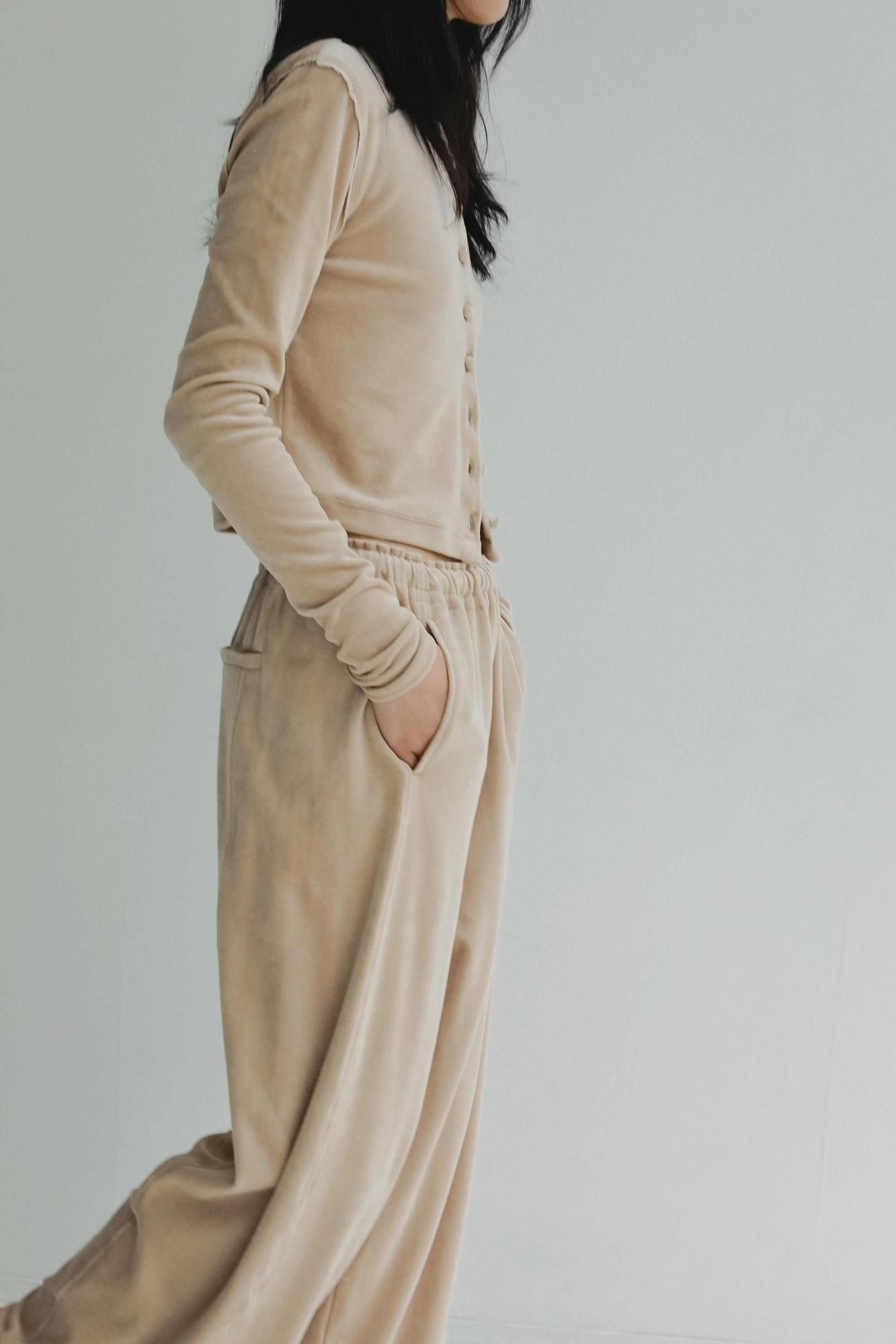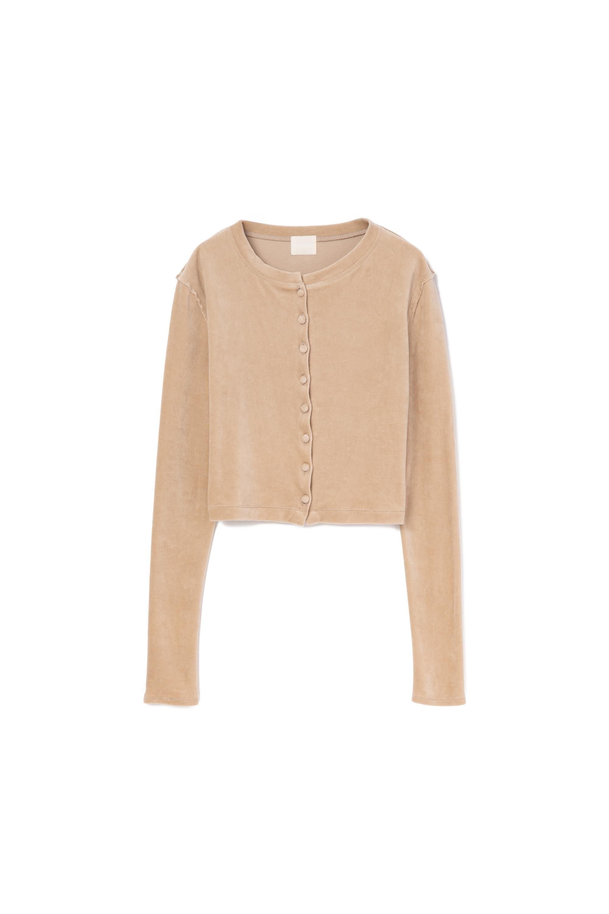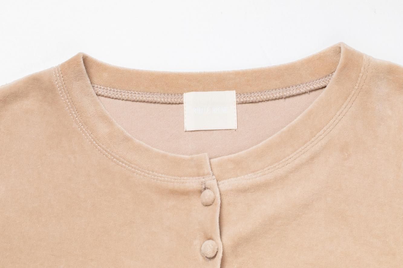 柔らかくしっかりとしたベロア素材で仕立てた、やや短めのコンパクトなカーディガン。