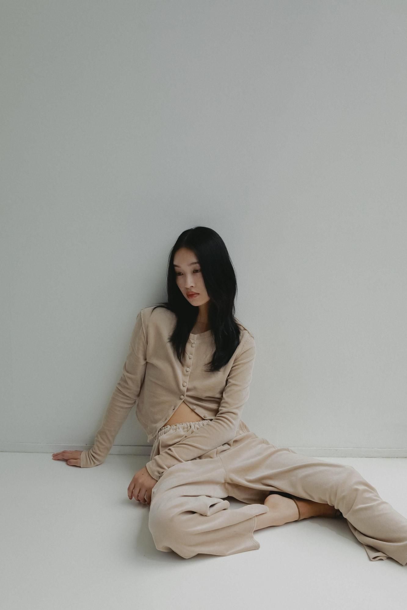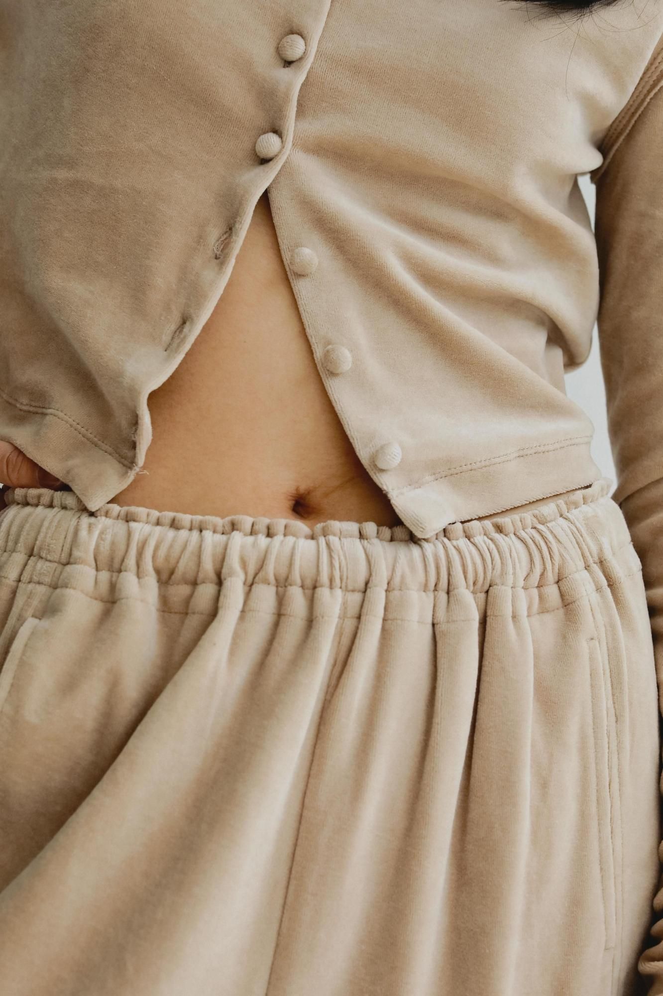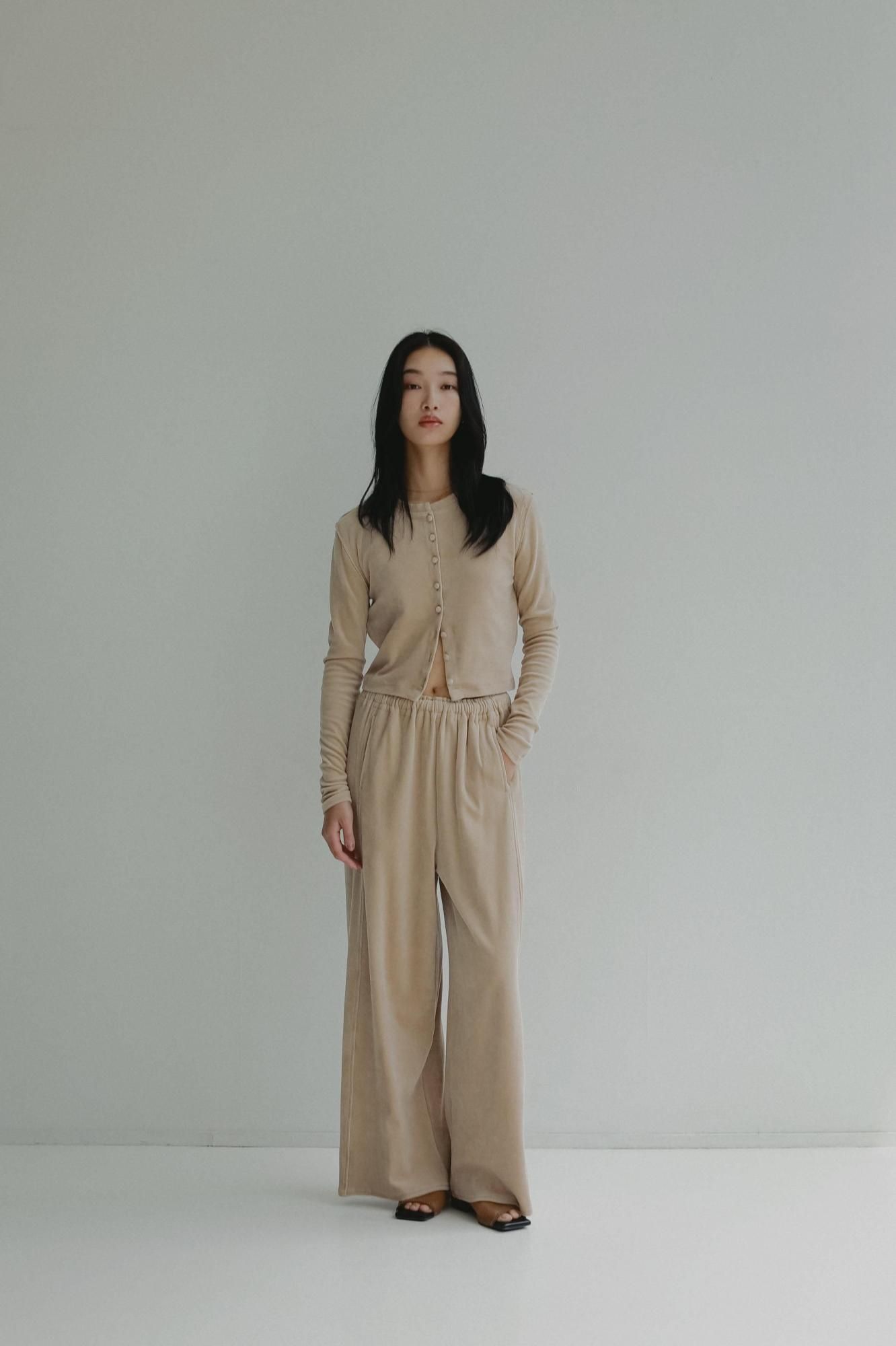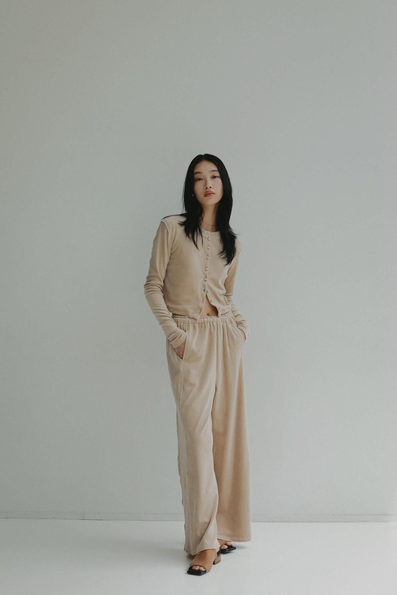 柔らかくしっかりとしたベロア素材で仕立てた、やや短めのコンパクトなカーディガン。