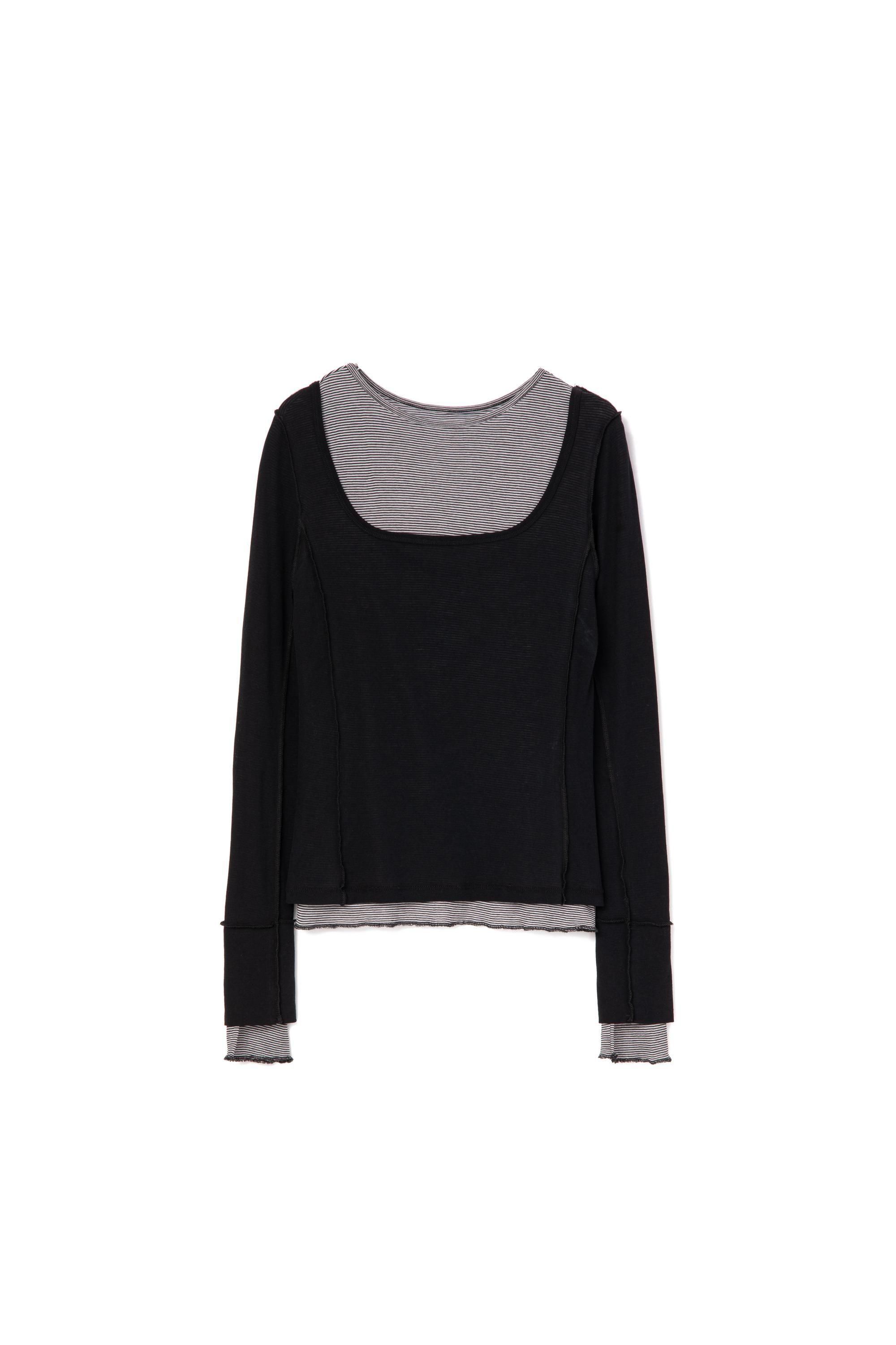 2枚仕立てのレイヤードトップスで、単品でも重ねてもスタイリングを楽しめる一着。