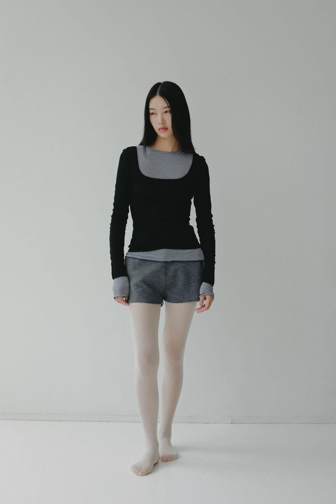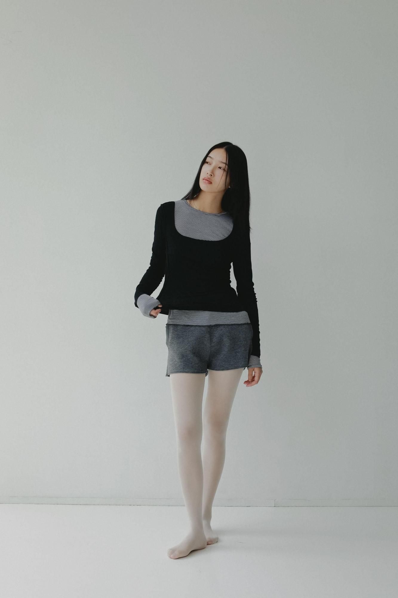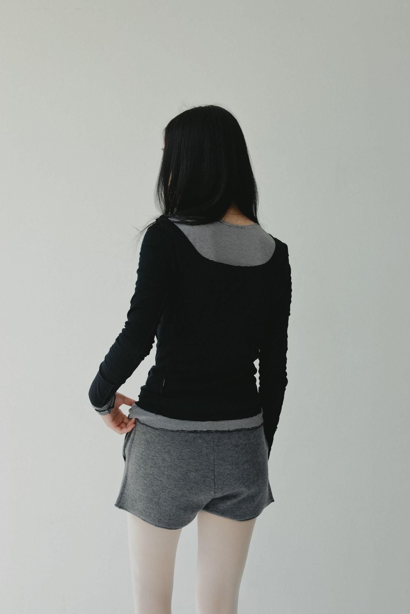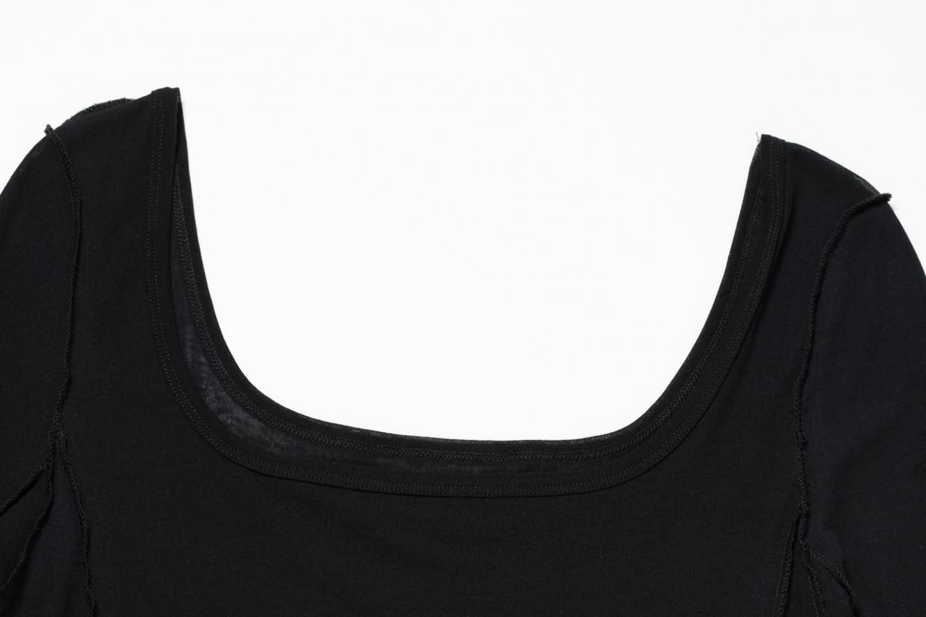 外側のトップスはスクエアネックと、ステッチをすべて表出しにしたデザインが特徴です。また内側のトップスはクルーネックで、袖と裾をメロウ仕上げにしました。どちらも同じ、ふんわりとシャリっと優しいタッチが特徴のシアーフライス素材を使用しています。秋のレイヤードスタイルに映えるデイリーに活躍する万能トップスです。