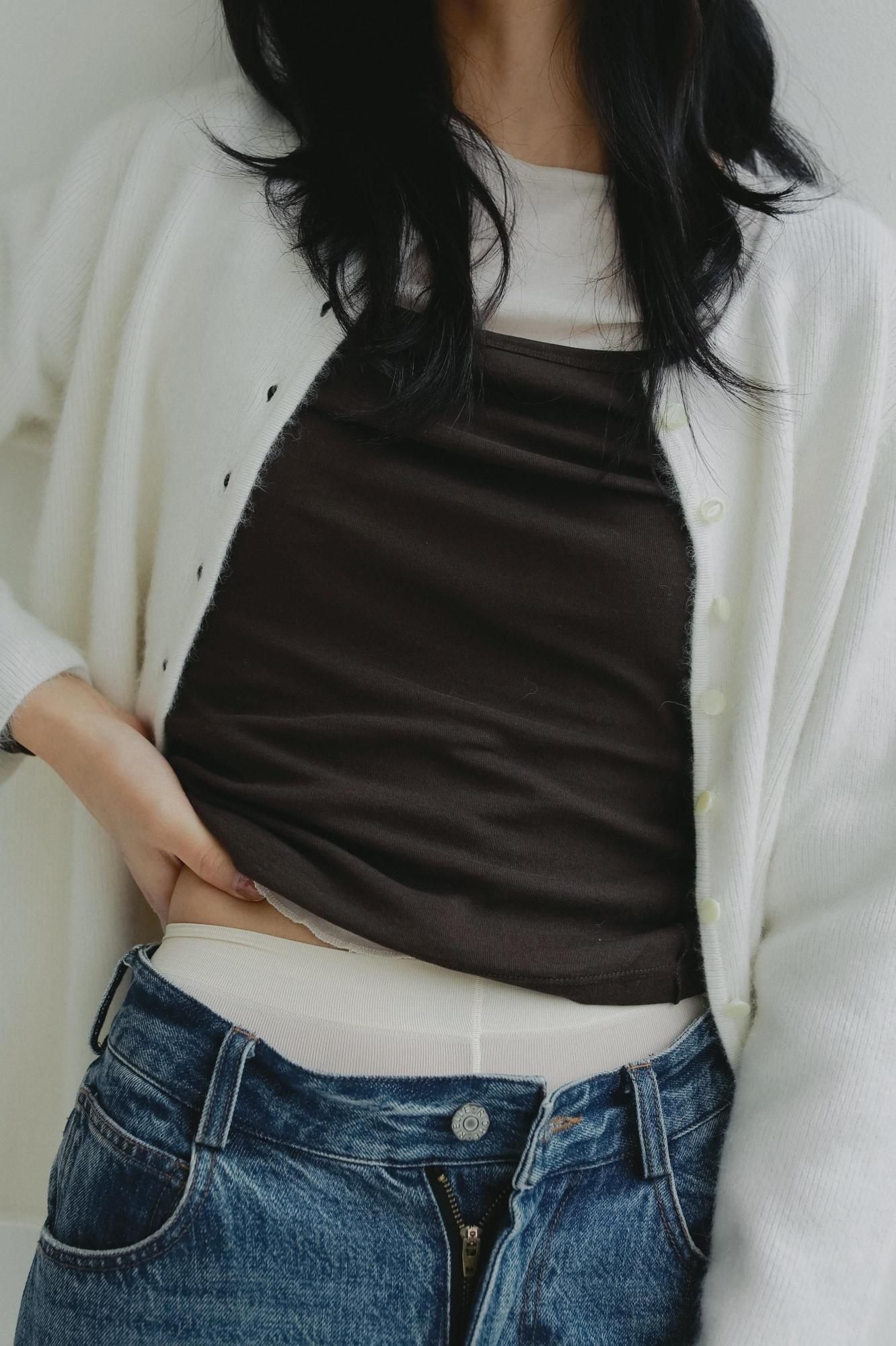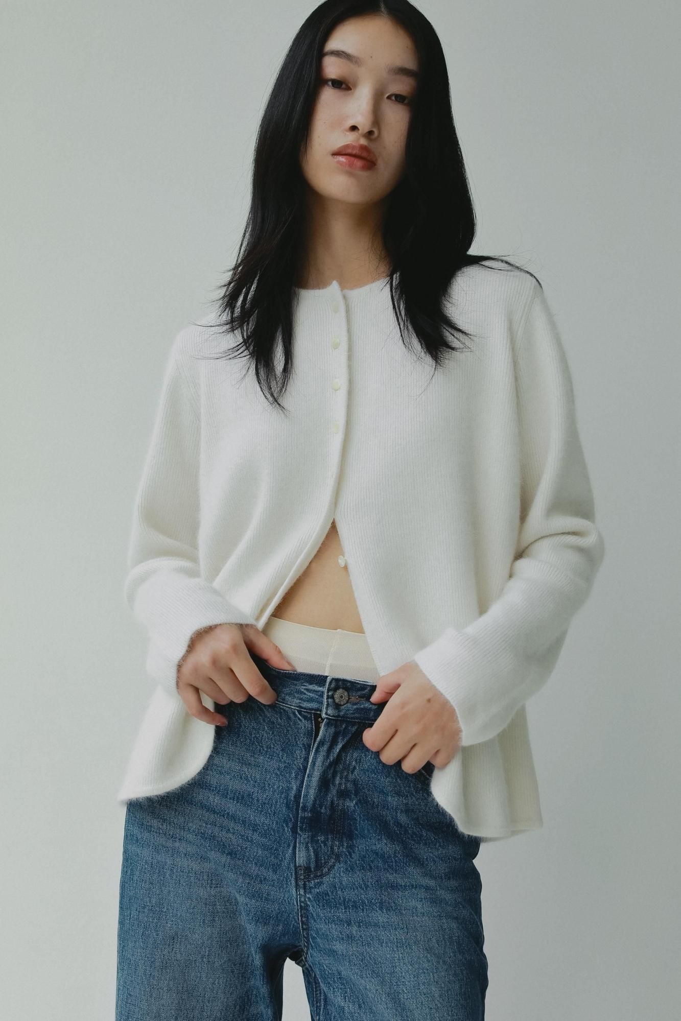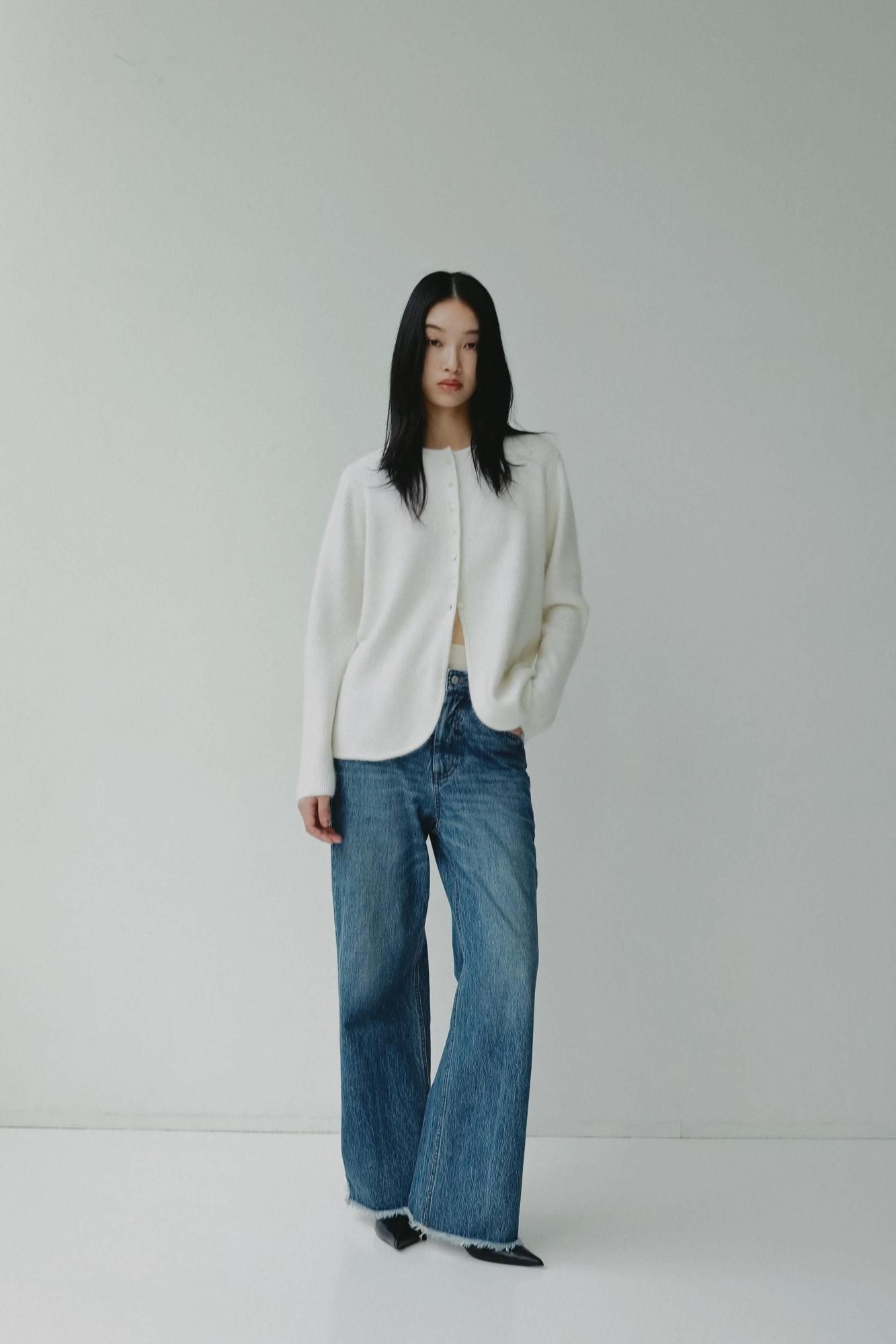 カーディガンとしてはもちろん、ボタンを留めてトップスとしてお召しいただくこともおすすめです。シンプルながら素材の存在感が際立つ一枚で、秋口から取り入れやすいアイテムです。