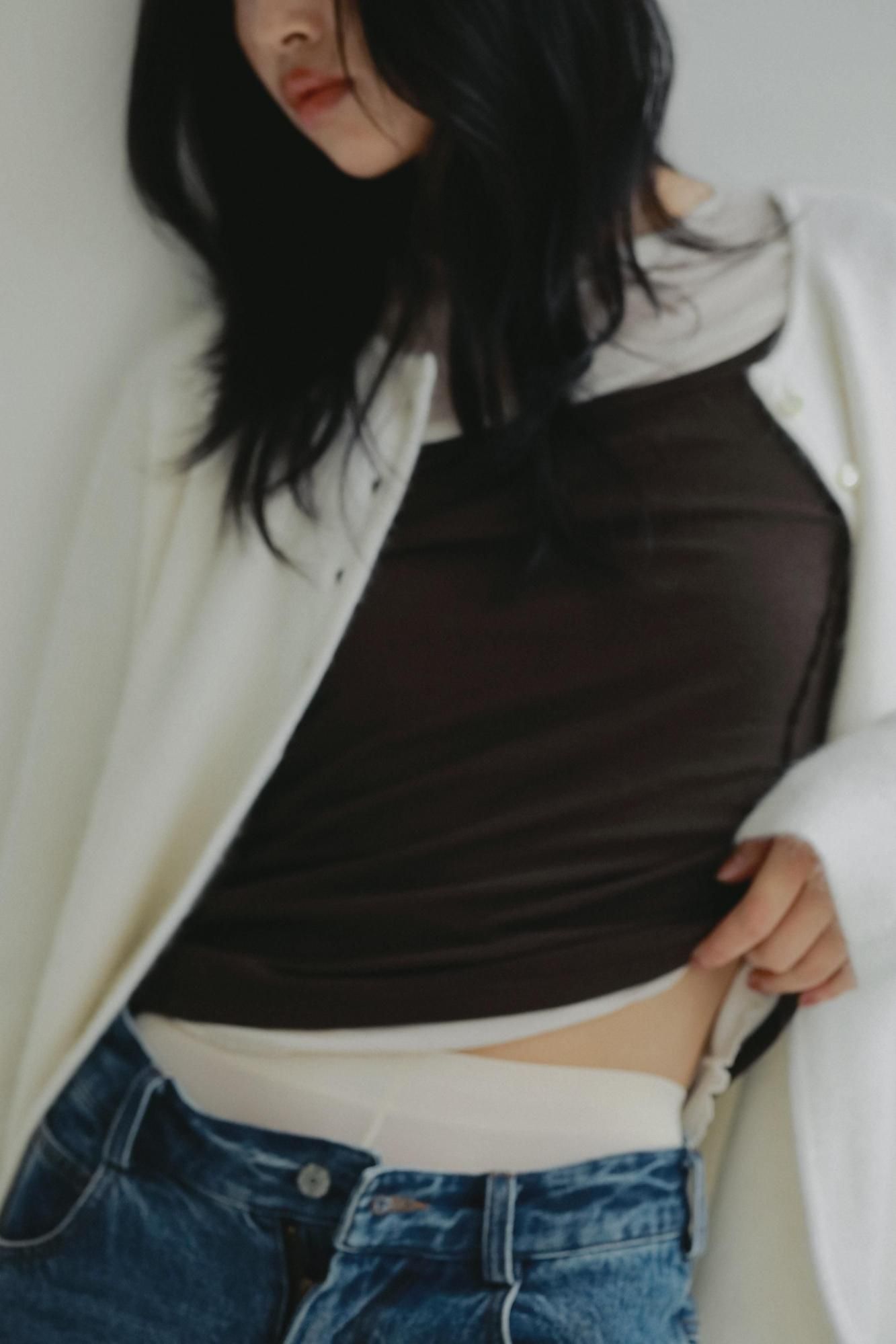 上半分にだけボタンを施すことで裾にかけて自然に開くデザインは、抜け感のある雰囲気を演出。羽織るだけでニュアンスのあるスタイルに仕上がります。またボタンにはシェルボタンを採用したのもポイントです。ストレートシルエットで程よくゆとりを持たせました。