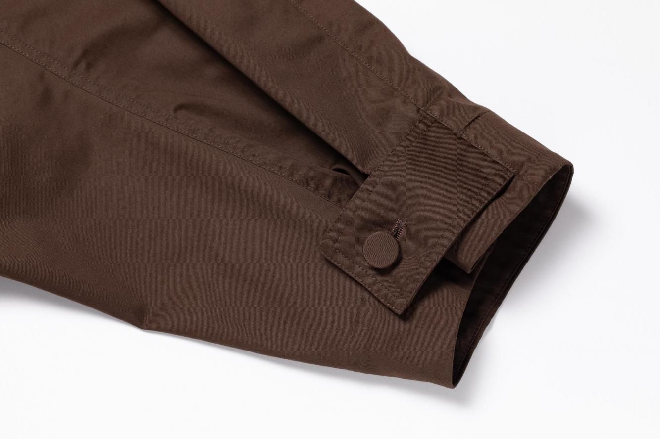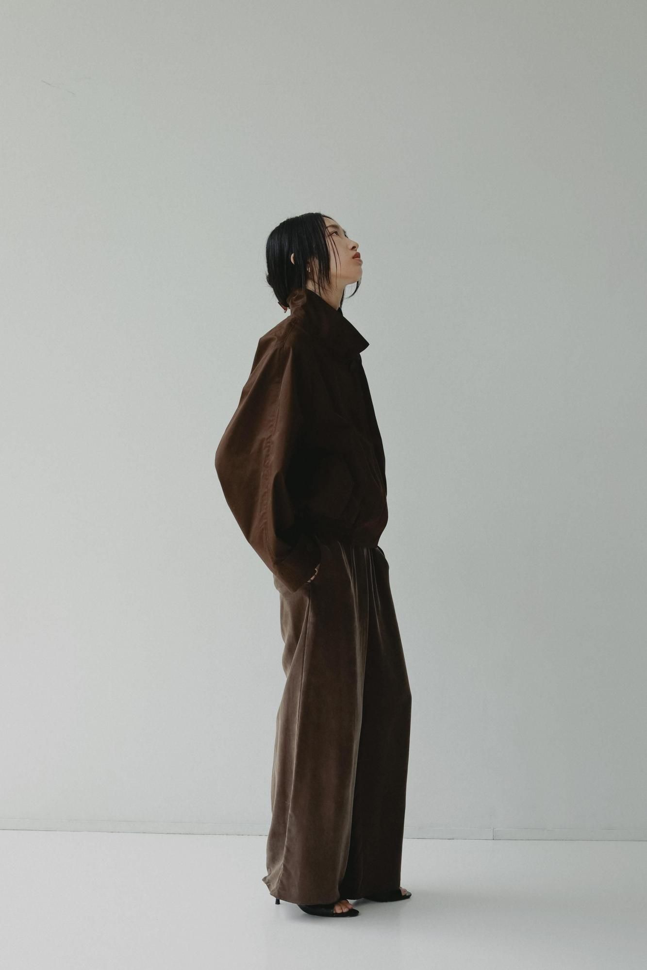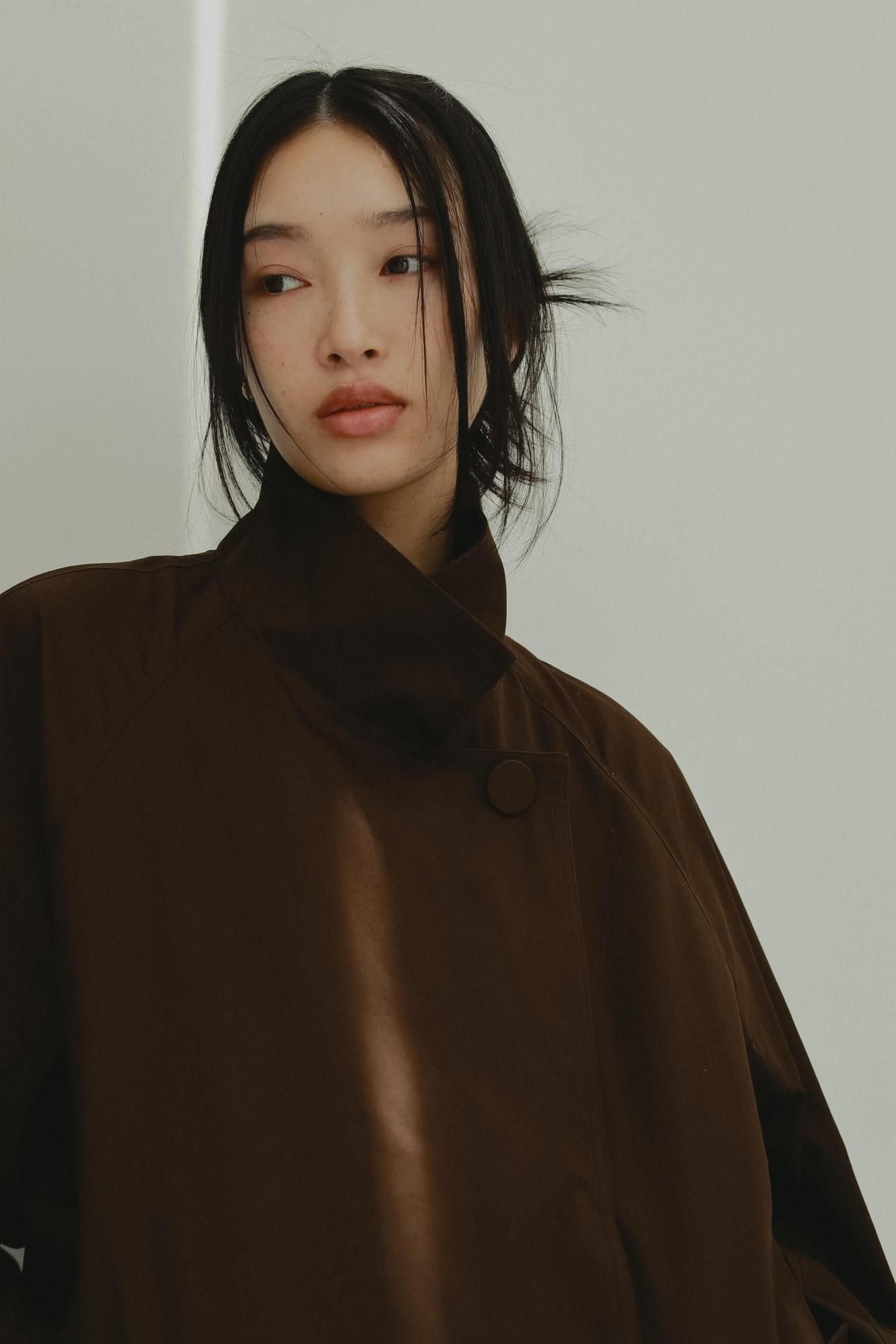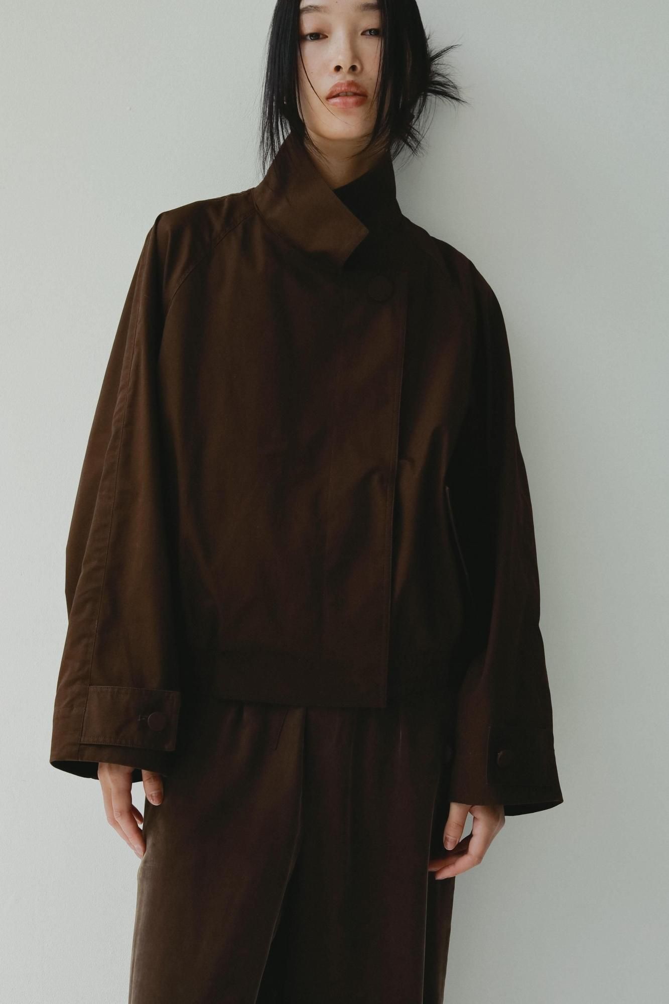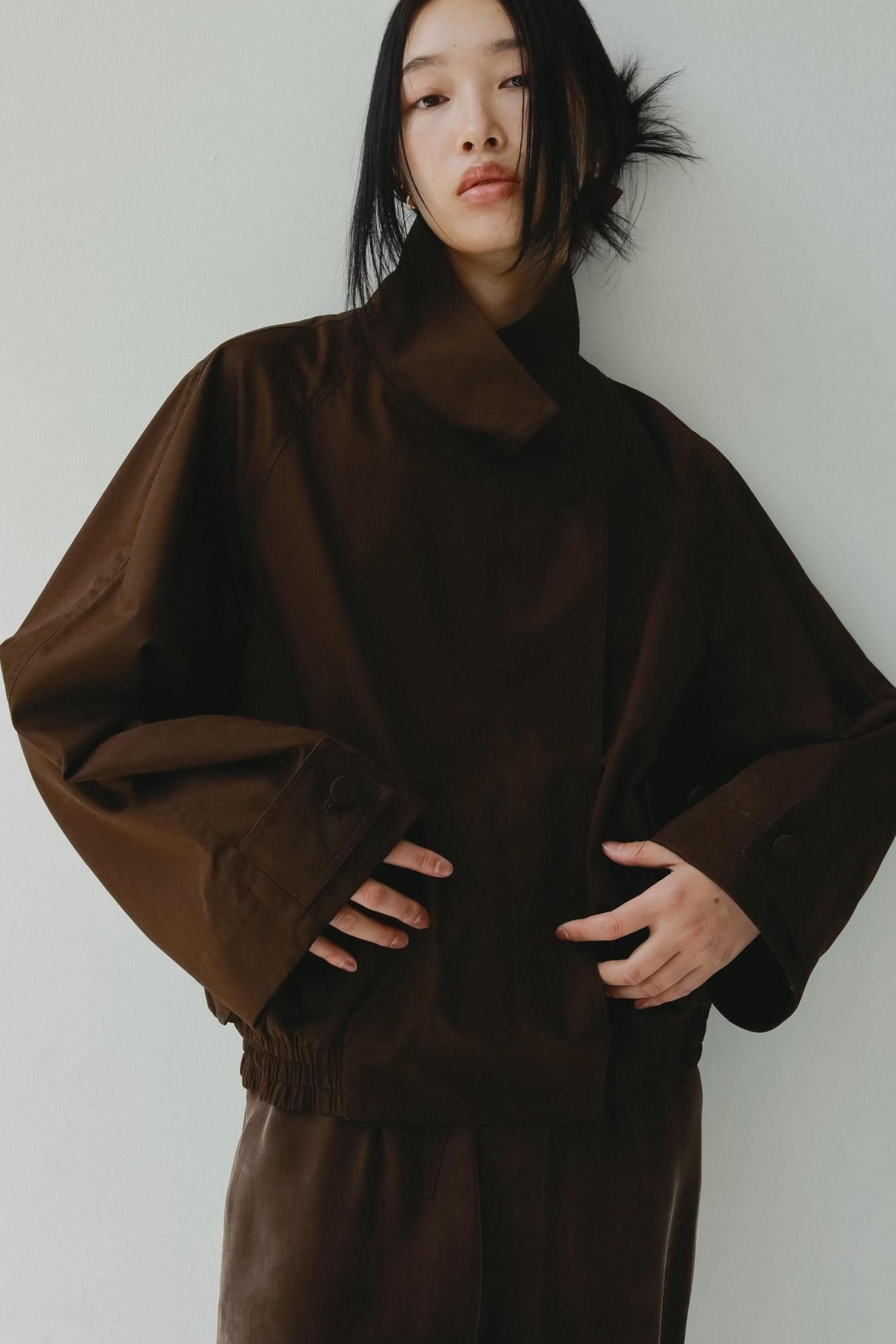 一番上のくるみボタンのみ表に見える仕様で、すっきりとした印象に仕上げています。裾にはゴムを入れ、丸みのあるバルーンシルエットを演出。また袖はゆったりとした太めのラインで、袖口の2つのボタンでシルエットを変えられる仕様です。襟は立たせてスタンドカラーとしても、折って着用しても、気分やお好みによって変えていただけます。