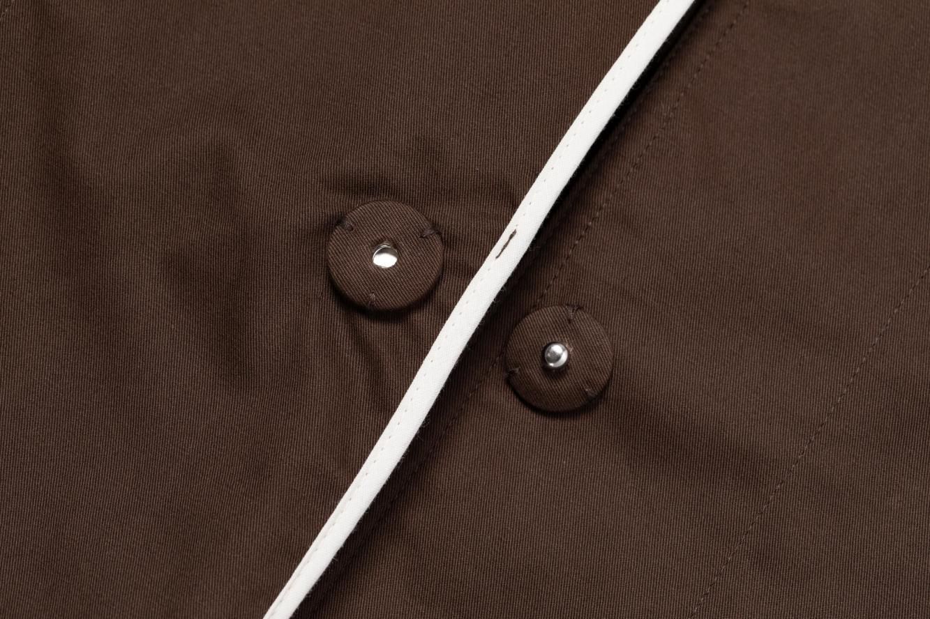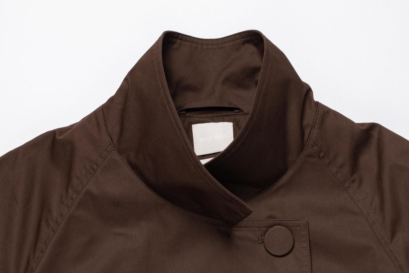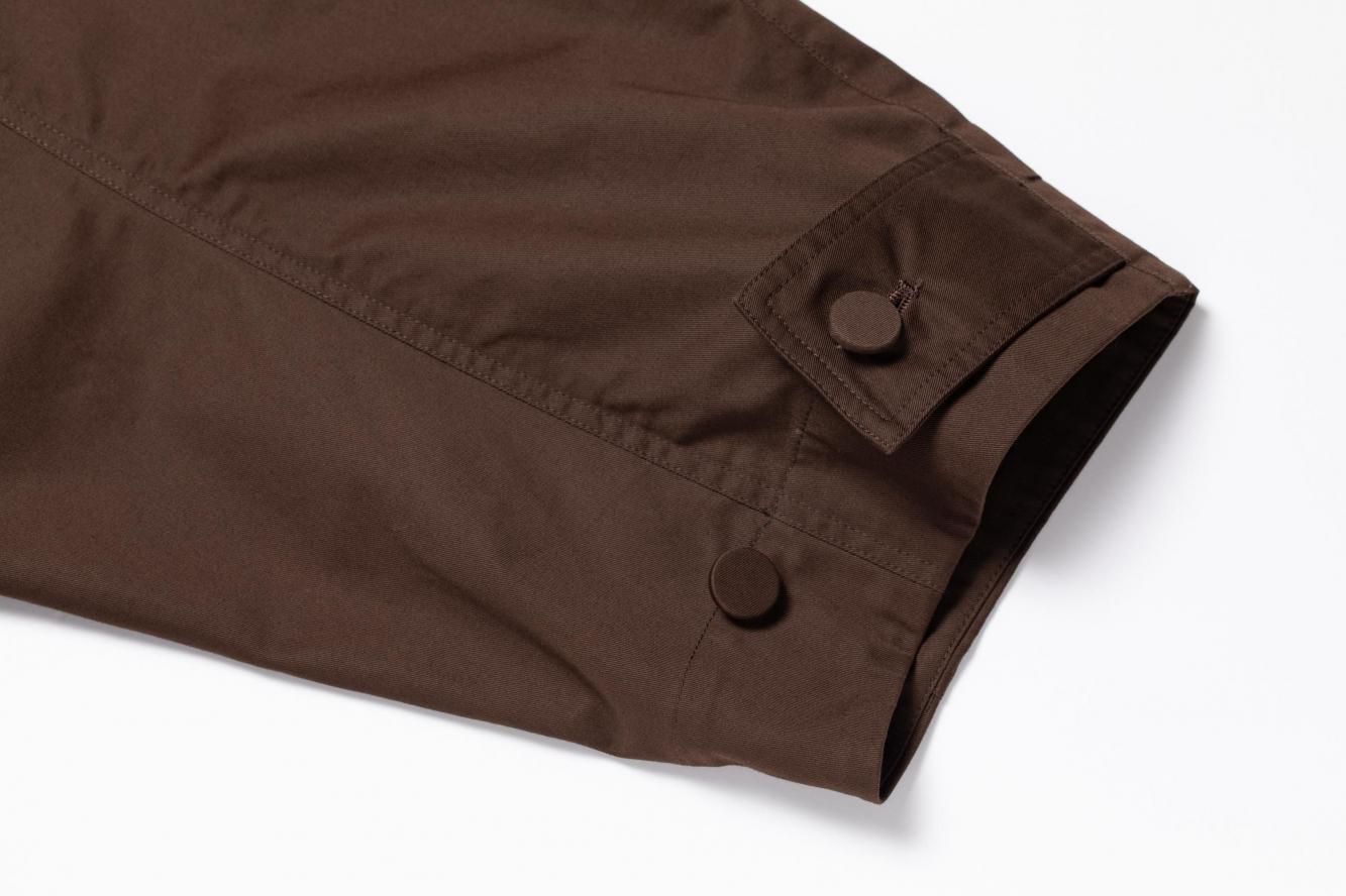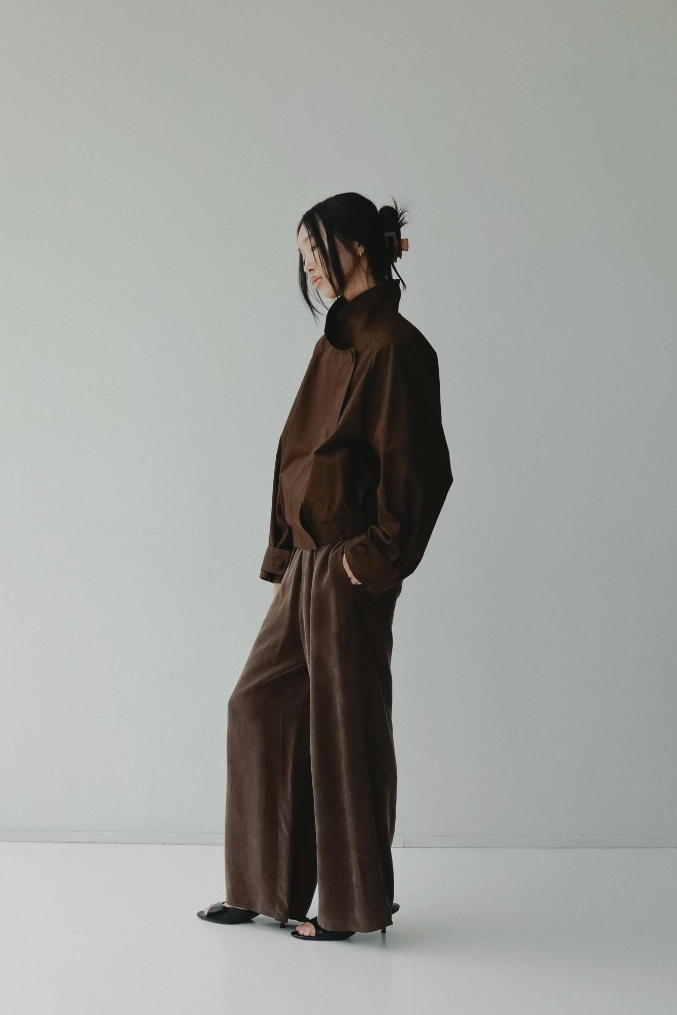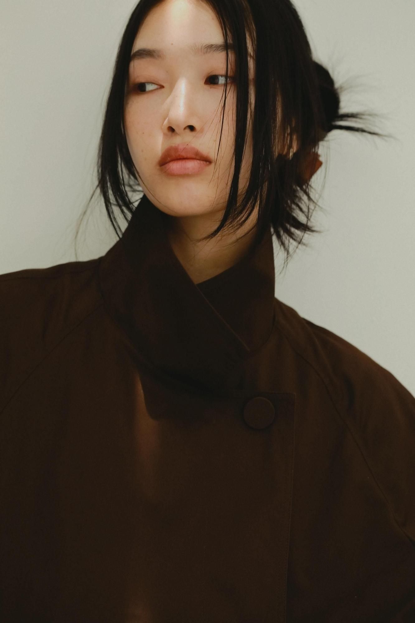 一番上のくるみボタンのみ表に見える仕様で、すっきりとした印象に仕上げています。裾にはゴムを入れ、丸みのあるバルーンシルエットを演出。また袖はゆったりとした太めのラインで、袖口の2つのボタンでシルエットを変えられる仕様です。襟は立たせてスタンドカラーとしても、折って着用しても、気分やお好みによって変えていただけます。