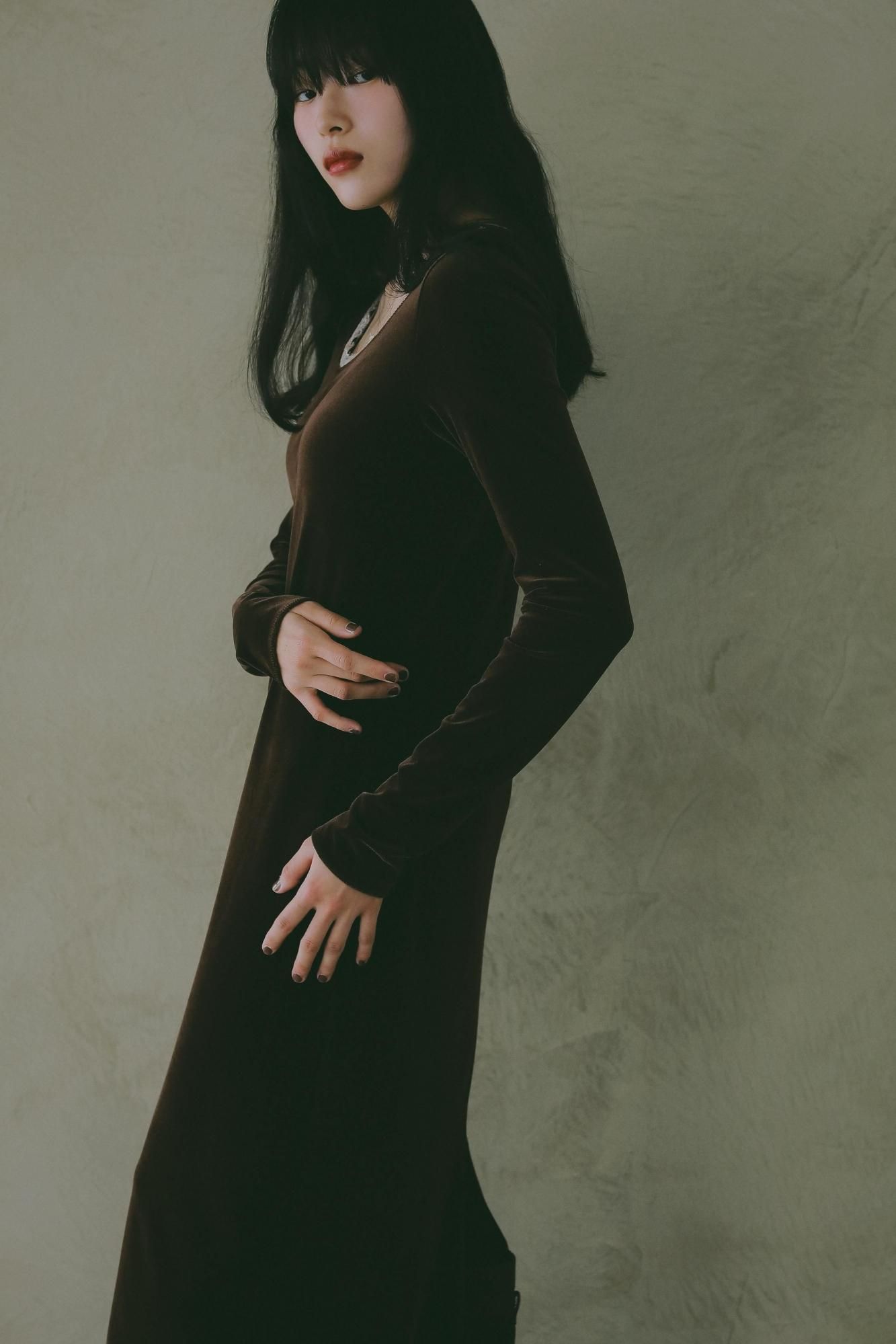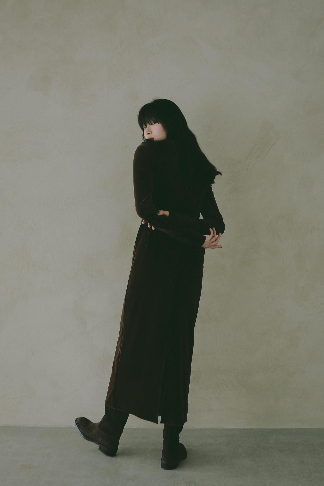 ほどよい光沢感と伸縮性を備えたベロア素材を使用したロングワンピース。