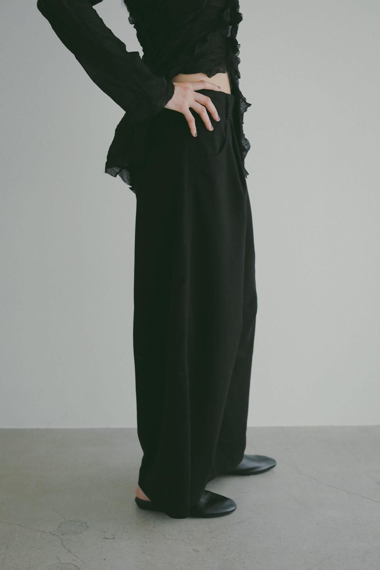 ゆるやかなワイドラインと腰履きのバランスが、抜け感のあるモードな印象を演出。ウエスト紐でジャストウエストでもローウエストでもお好みの位置で着用いただけます。