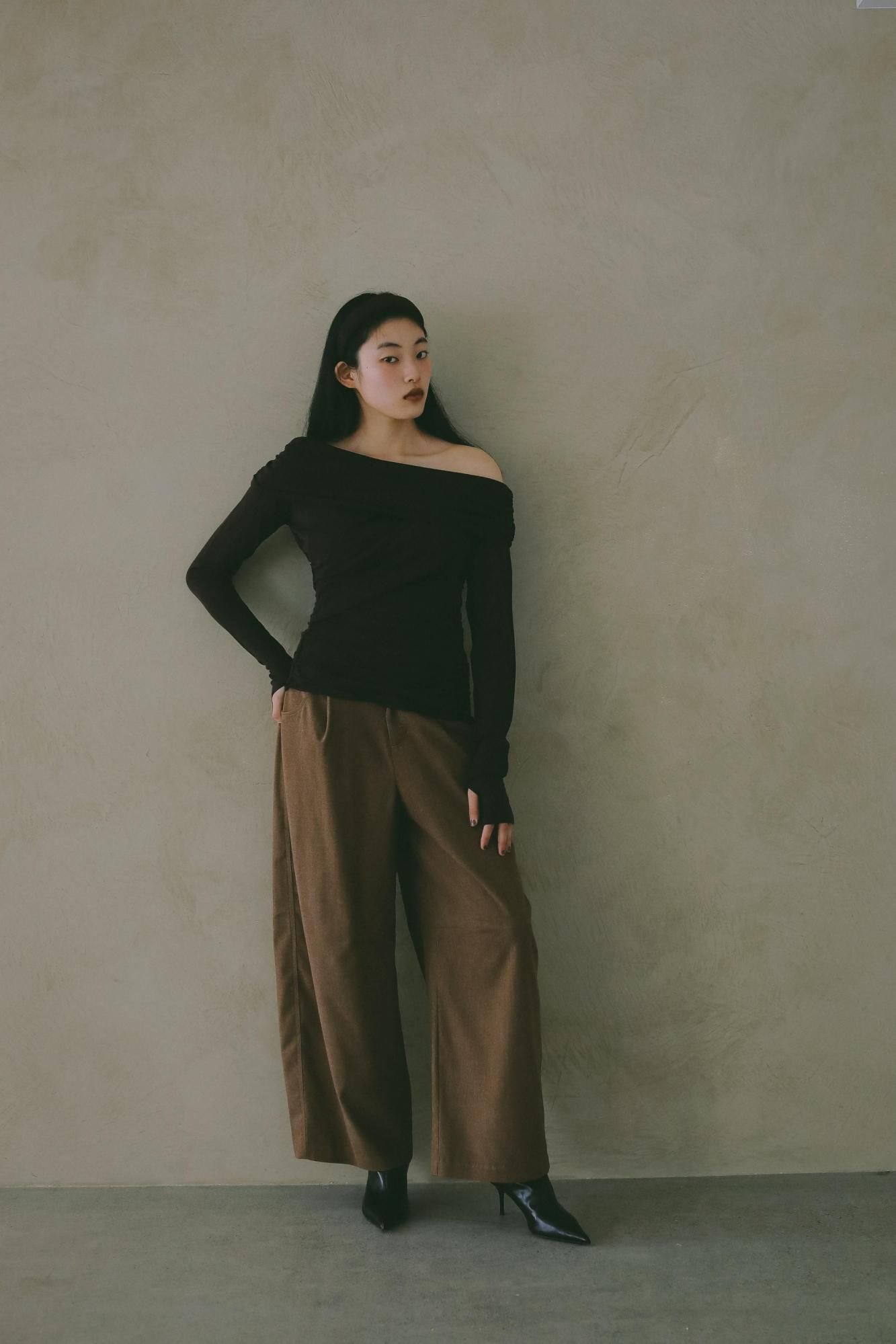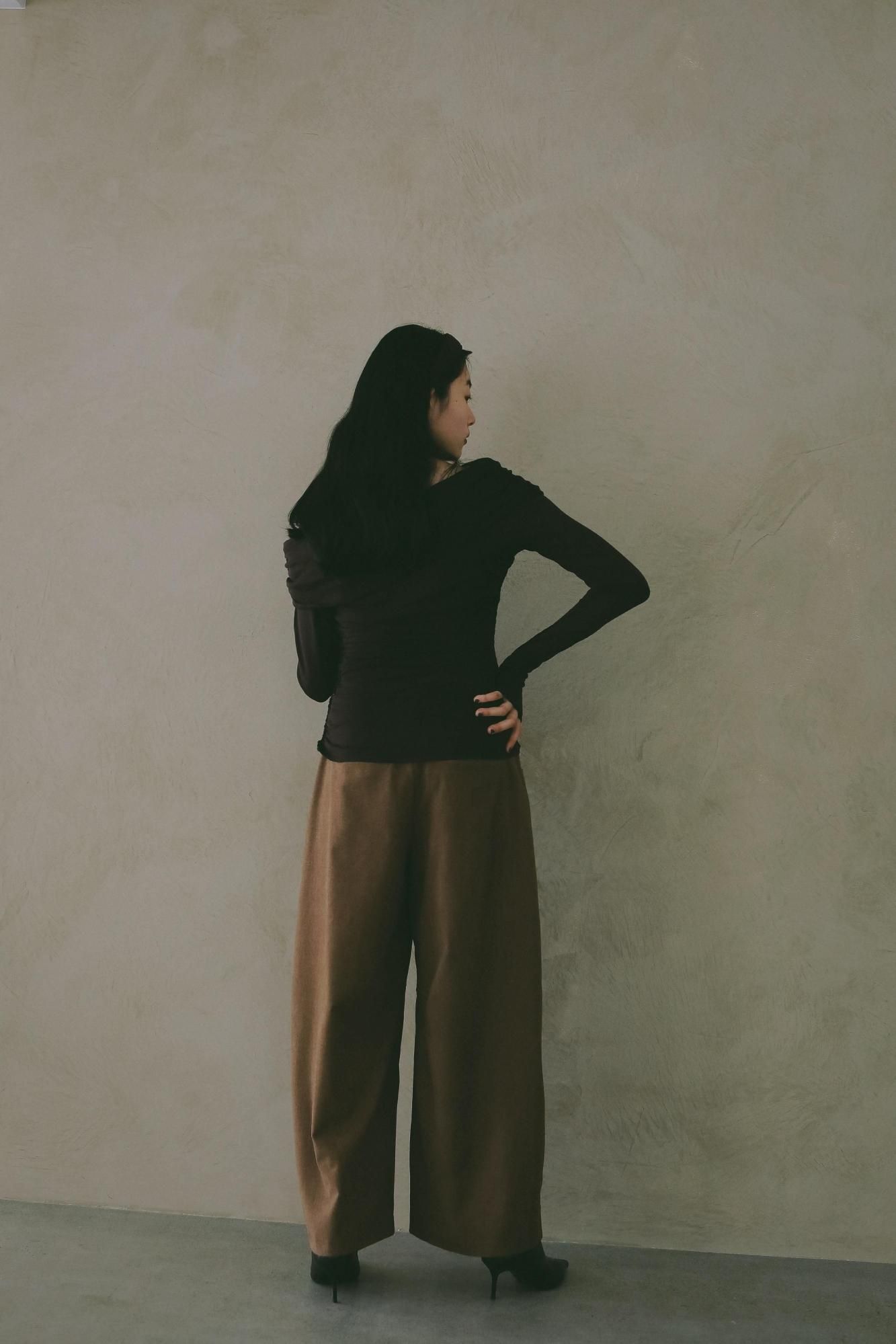 ゆるやかなワイドラインと腰履きのバランスが、抜け感のあるモードな印象を演出。ウエスト紐でジャストウエストでもローウエストでもお好みの位置で着用いただけます。
