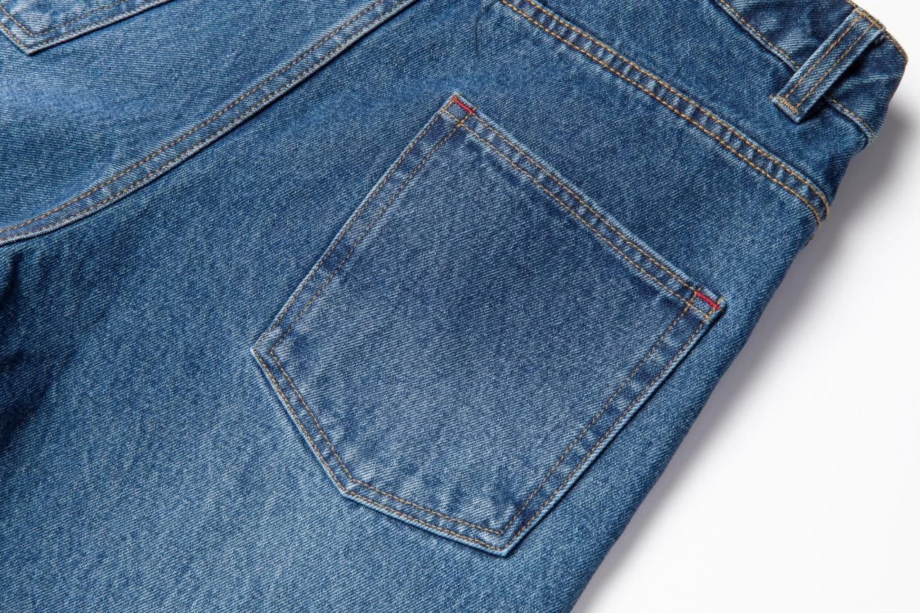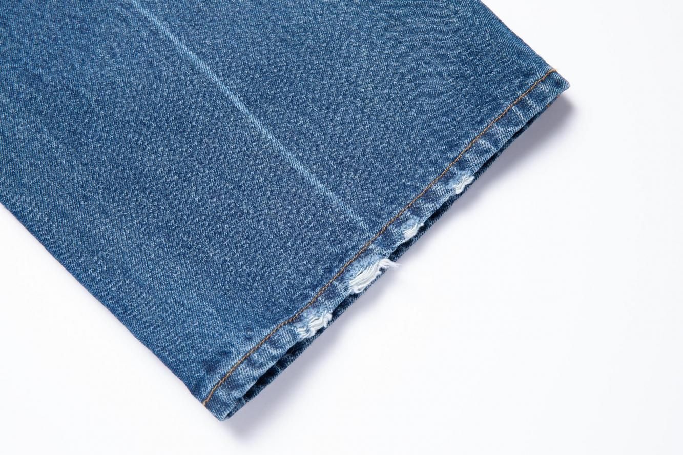 後ろポケットの角に施した赤いステッチと、ブランドオリジナルのネオバボタンがさりげないポイント。後ろ裾には控えめなダメージ加工を加え、ほんのりヴィンテージな印象に仕上げました。