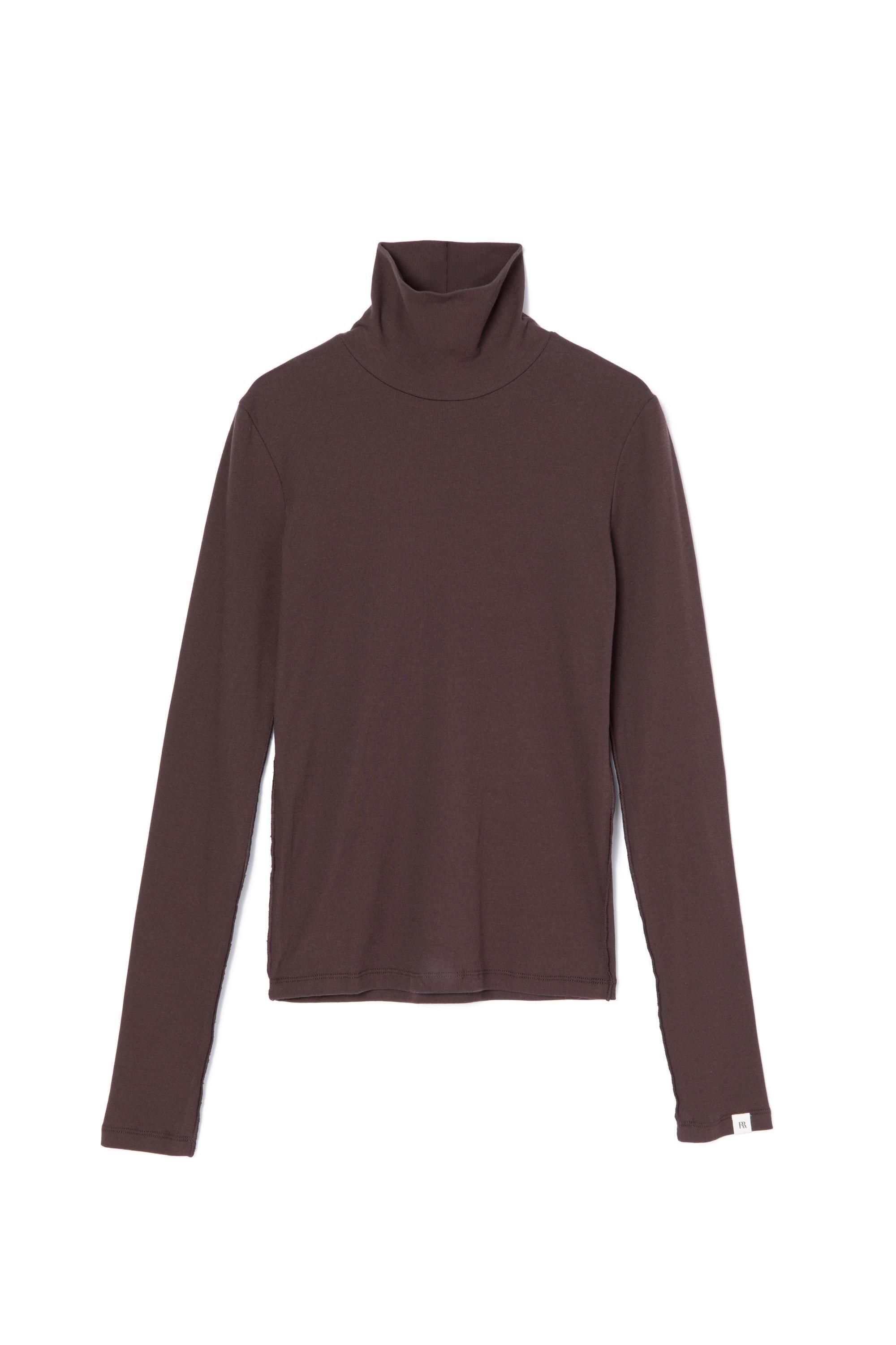 柔らかく伸びのあるフライス素材で仕立てたタートルネックトップス。