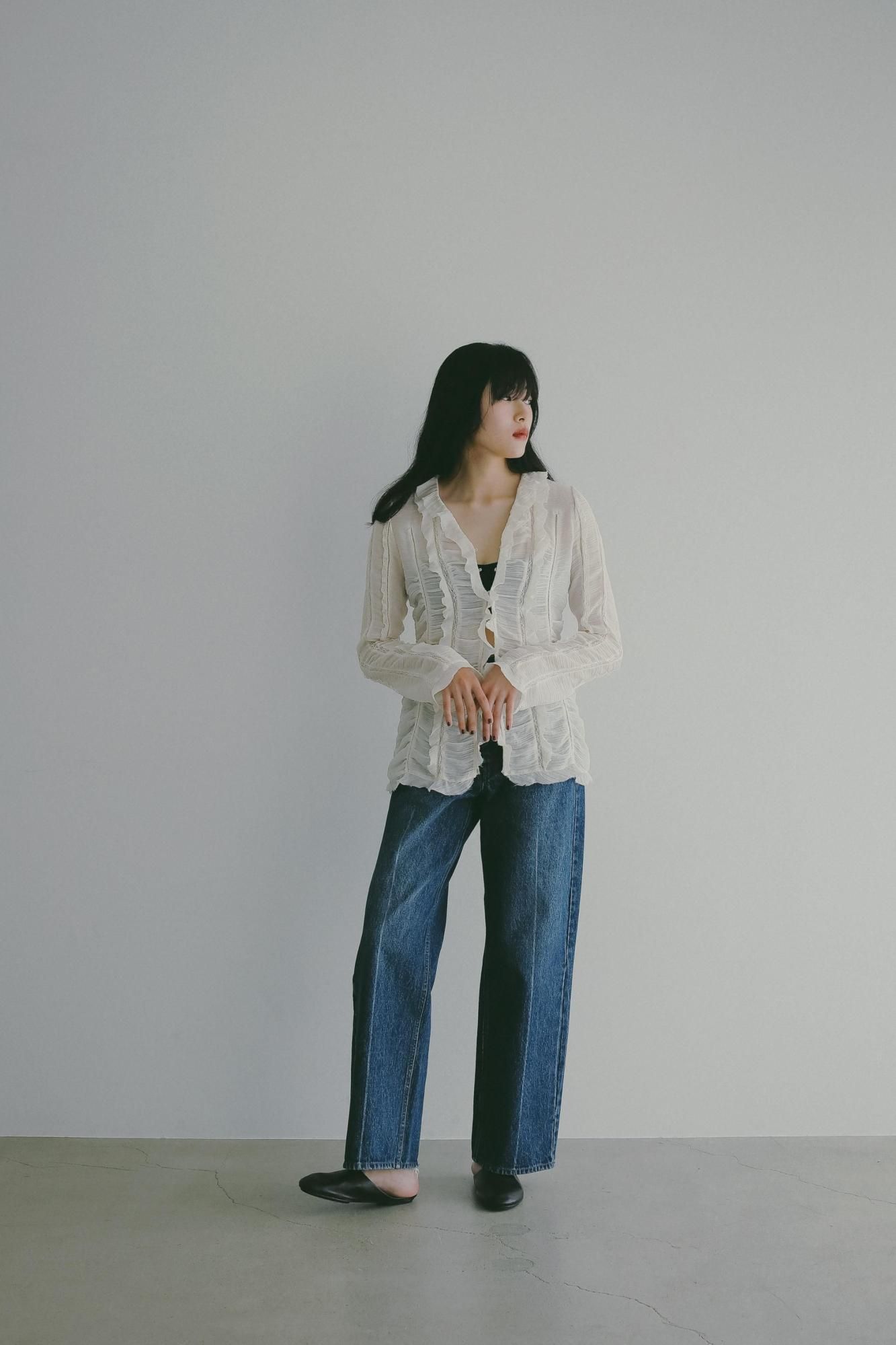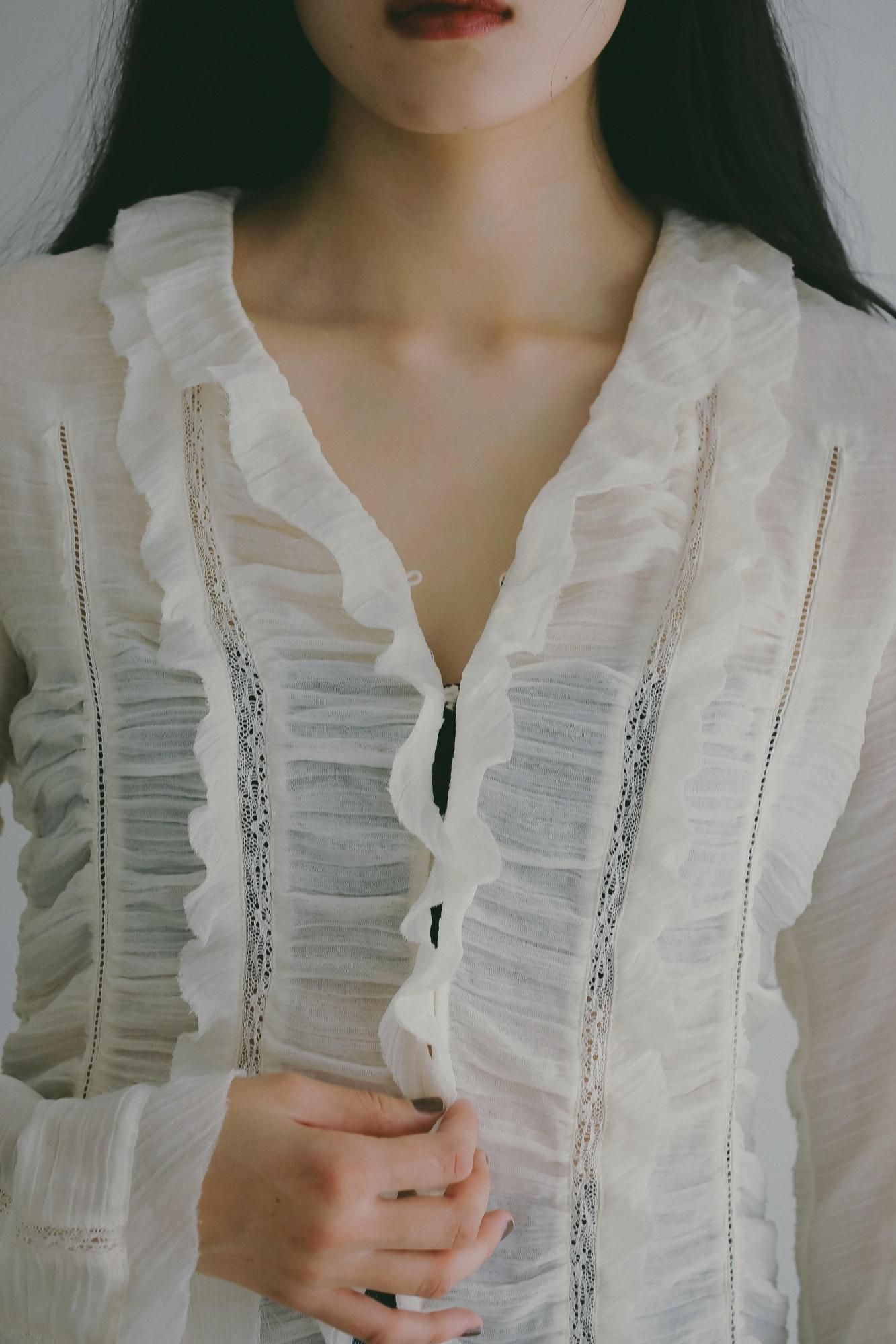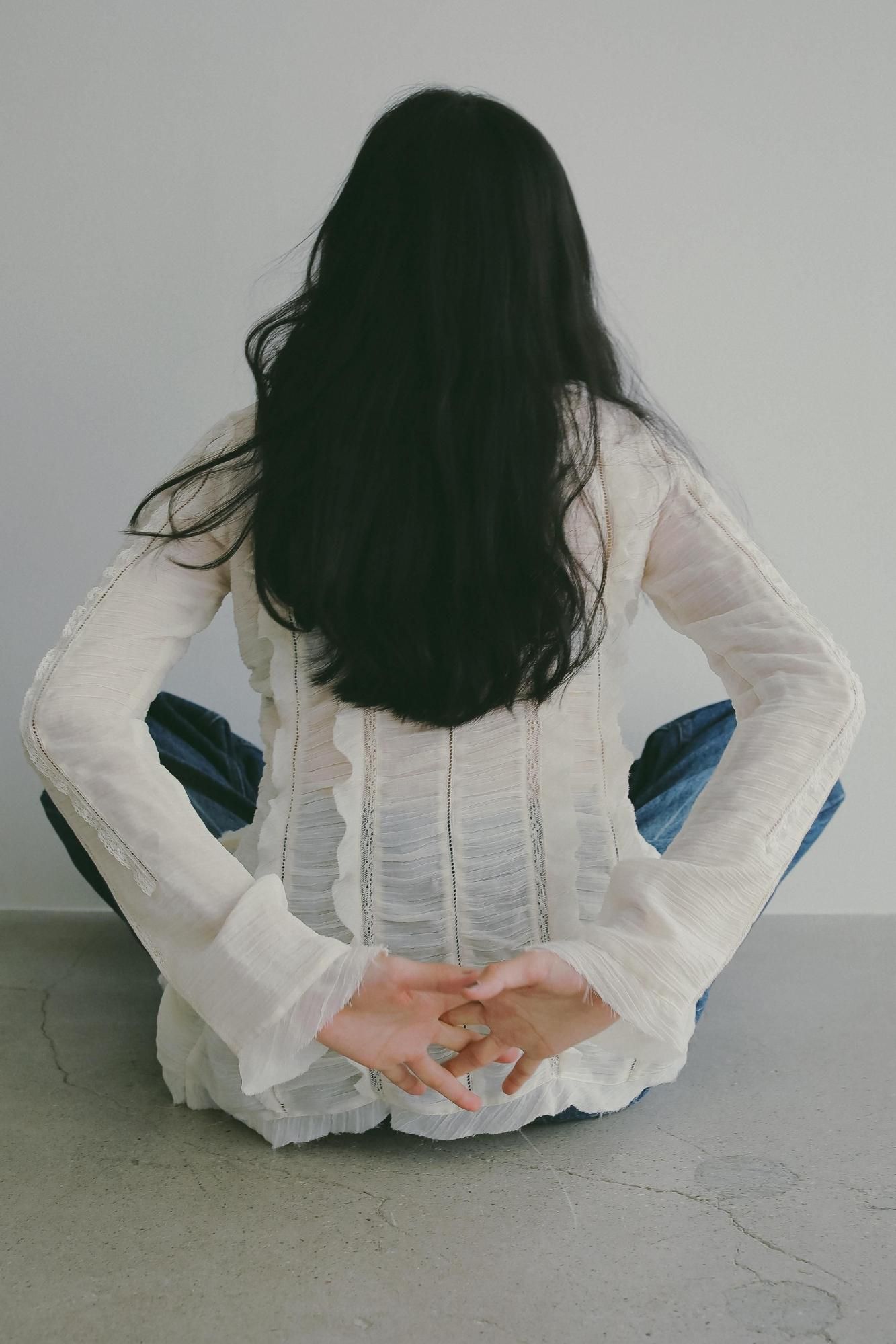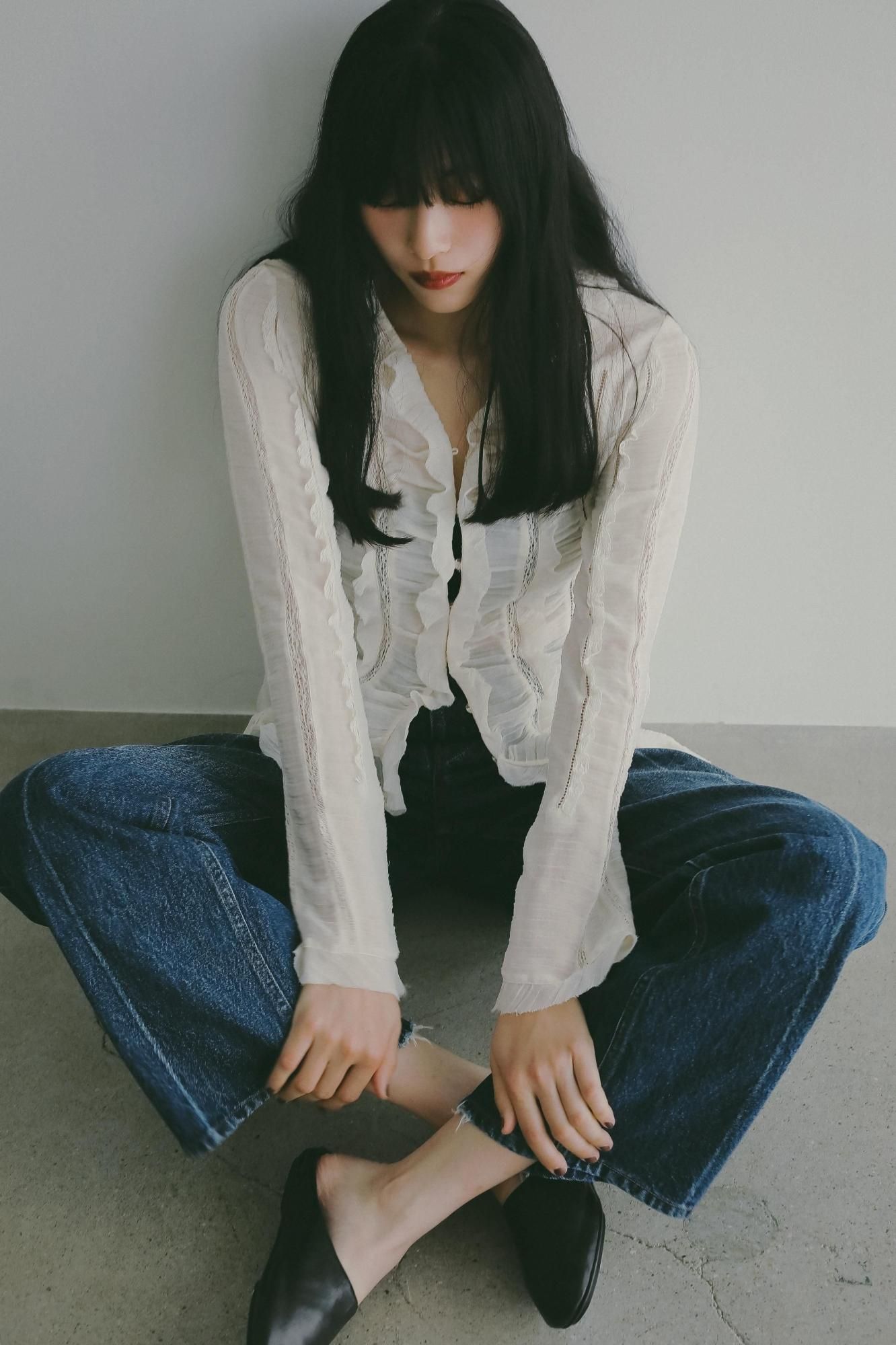 フリルをふんだんに取り入れながらも断ち切り仕様にすることで、甘さを抑えたカジュアルな雰囲気をプラス。繊細なディテールと柔らかな素材が織りなす、フェミニンさと抜け感を両立した一枚です。