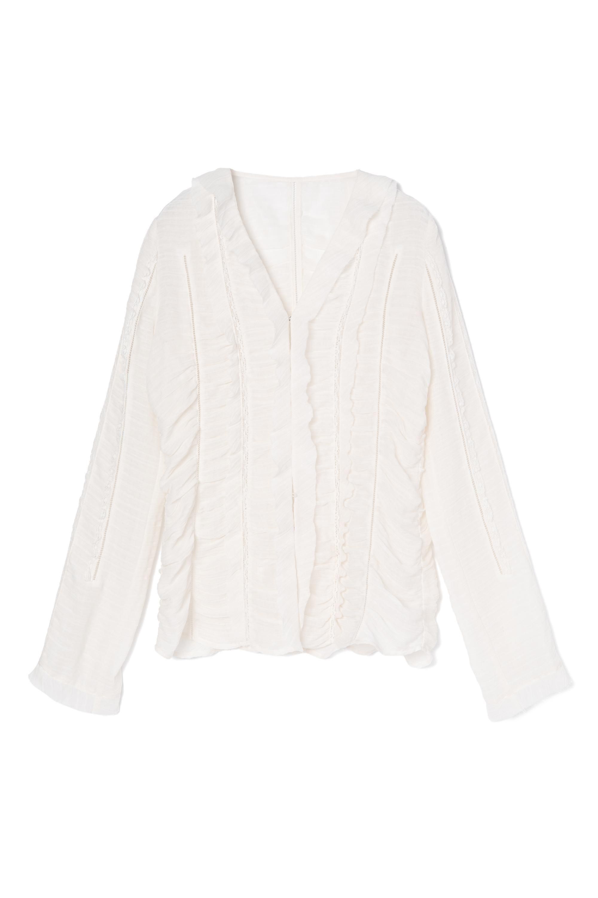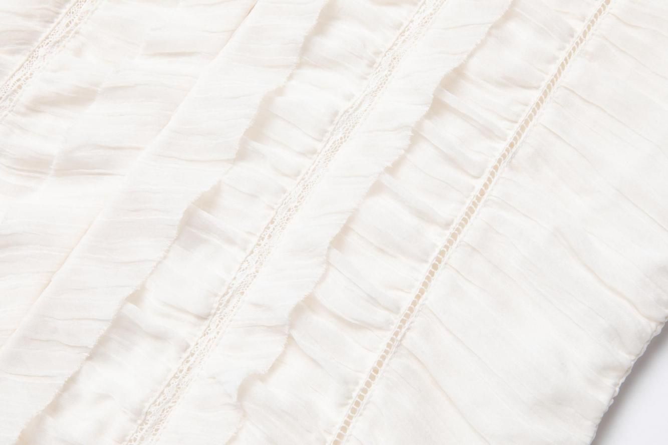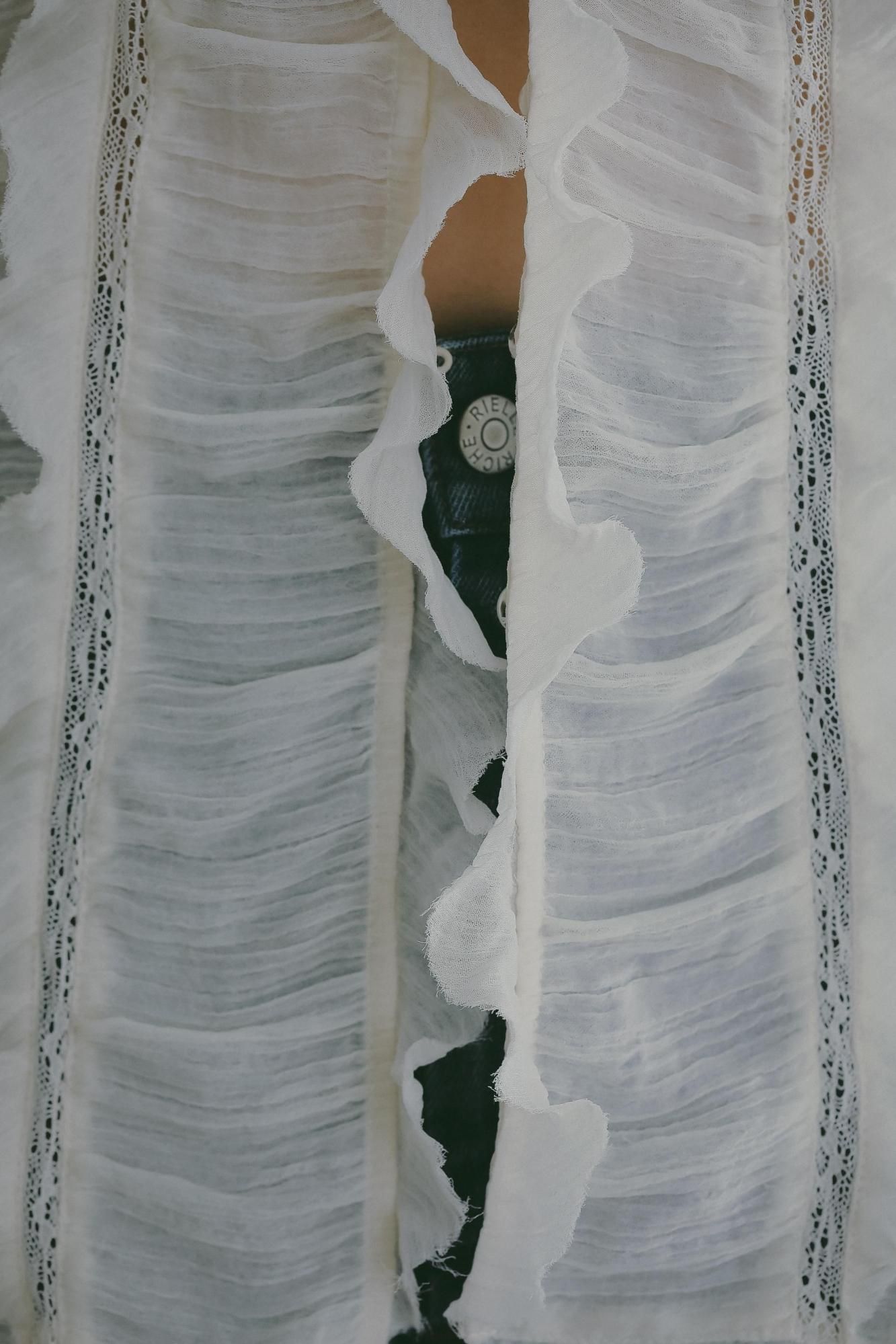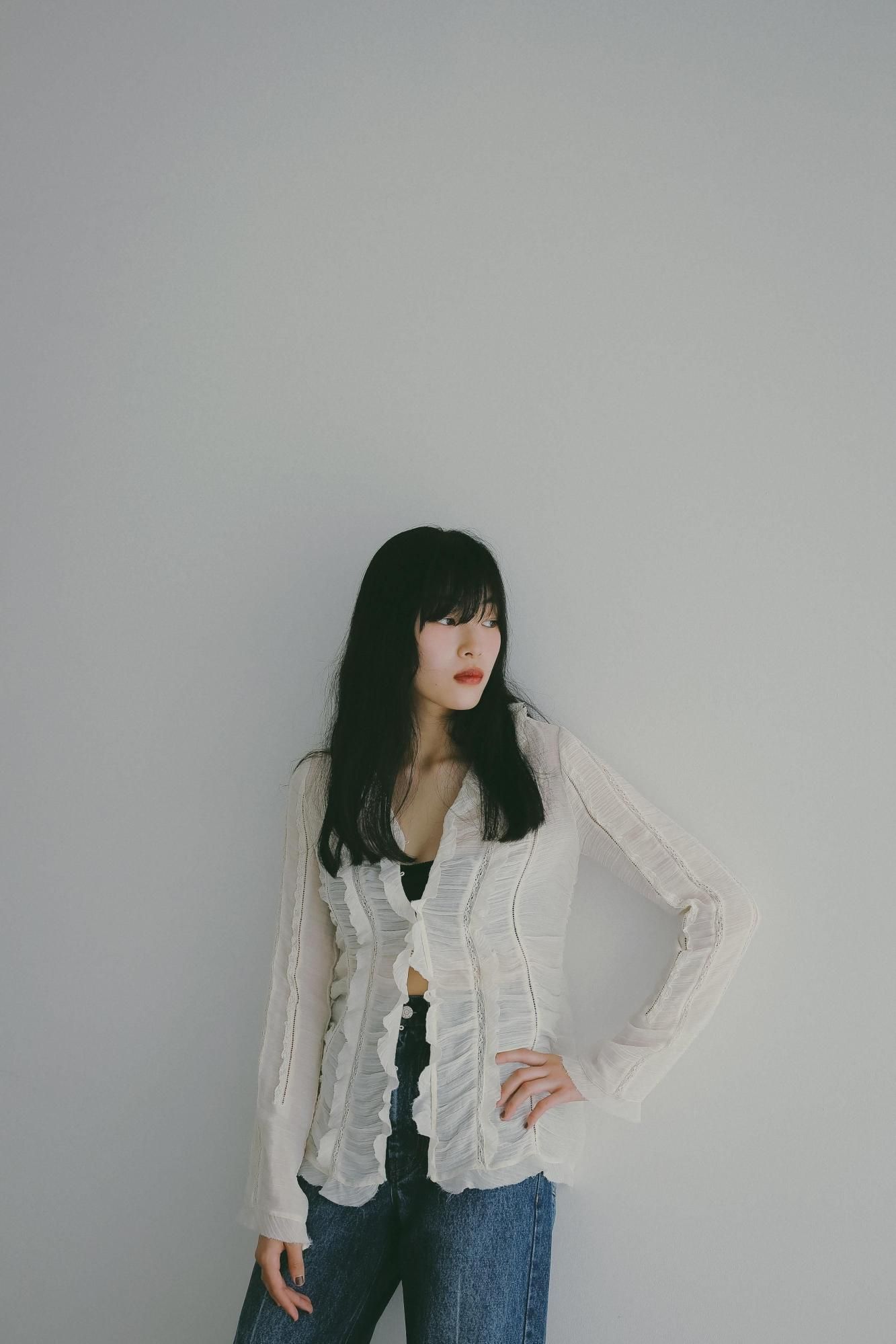 フリルをふんだんに取り入れながらも断ち切り仕様にすることで、甘さを抑えたカジュアルな雰囲気をプラス。繊細なディテールと柔らかな素材が織りなす、フェミニンさと抜け感を両立した一枚です。